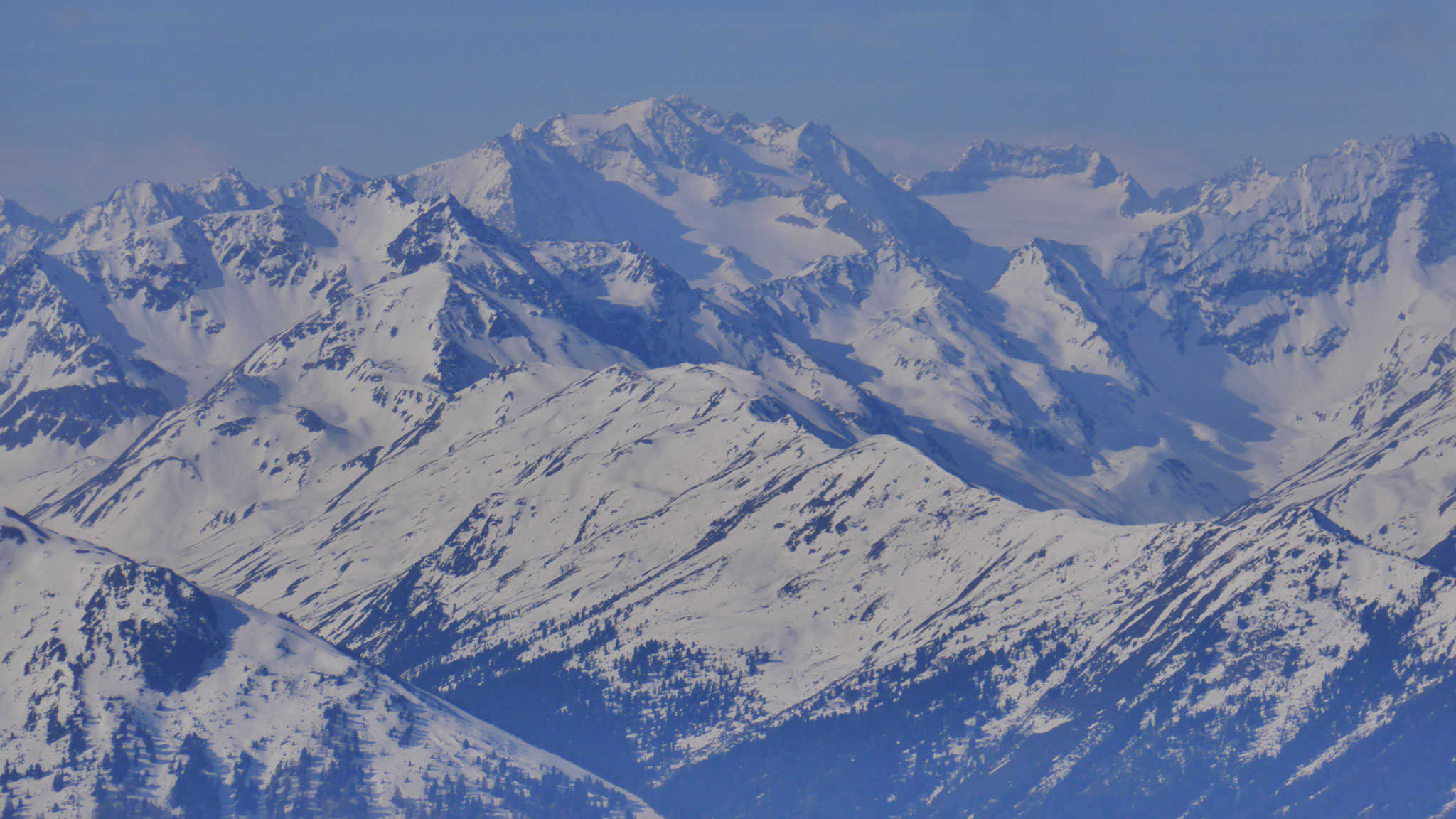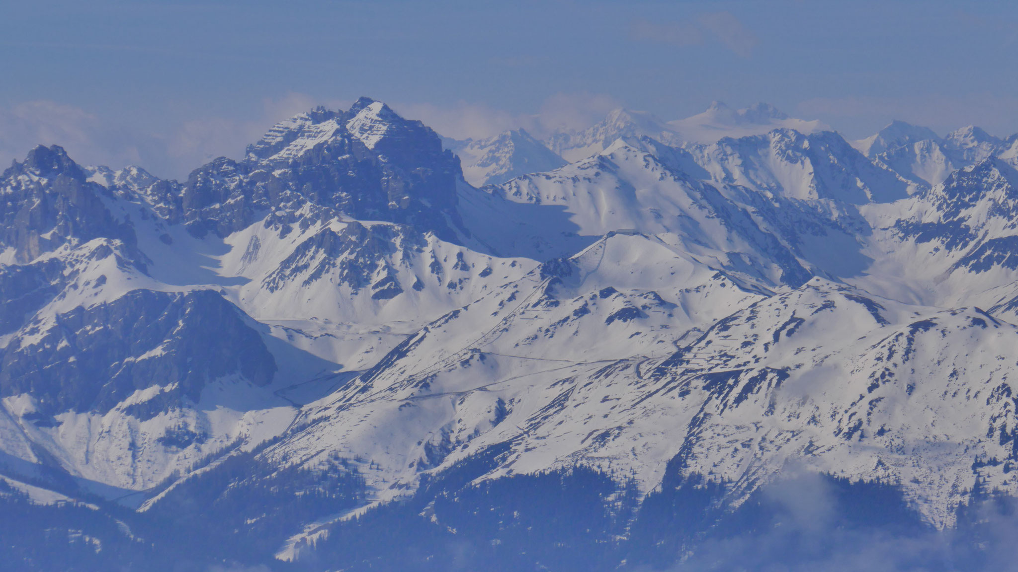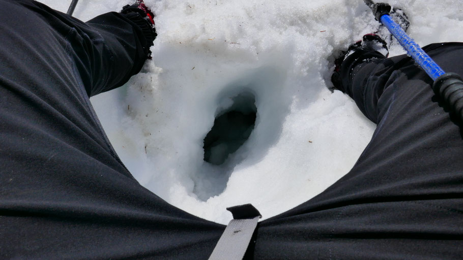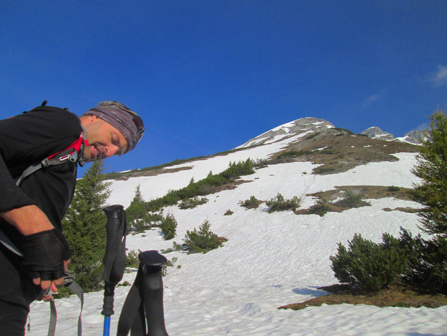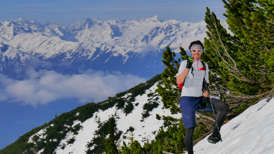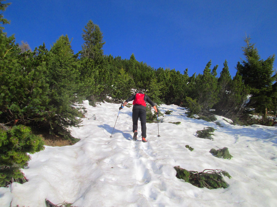 Danach wartet der Latschekampf - etwa 150 Höhenmeter ist pampiger Schnee unser Weggefährte. Aber zum Glück nur