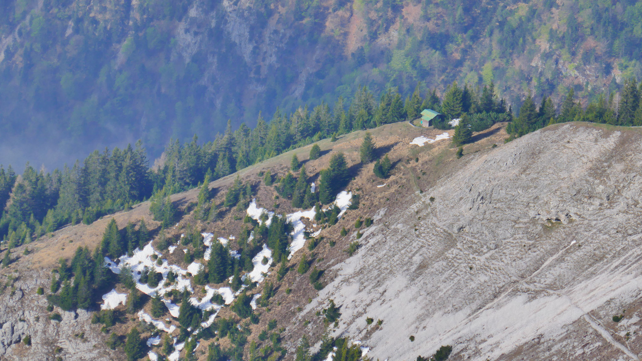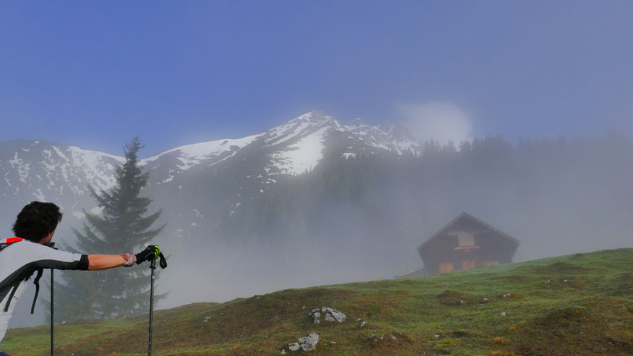 Einige flache Gehmeter weiter taucht die Achselbodenhütte (1645 m) aus dem Nebel auf. Dahinter zeigt sich das