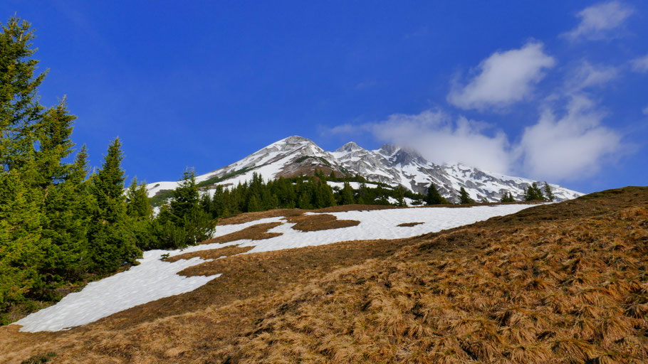 Zurück am Parkplatz zeigt sich uns noch ein letztes Mal das Brandjochkreuz, unser Weg ist gut erkennbar. Eine schöne