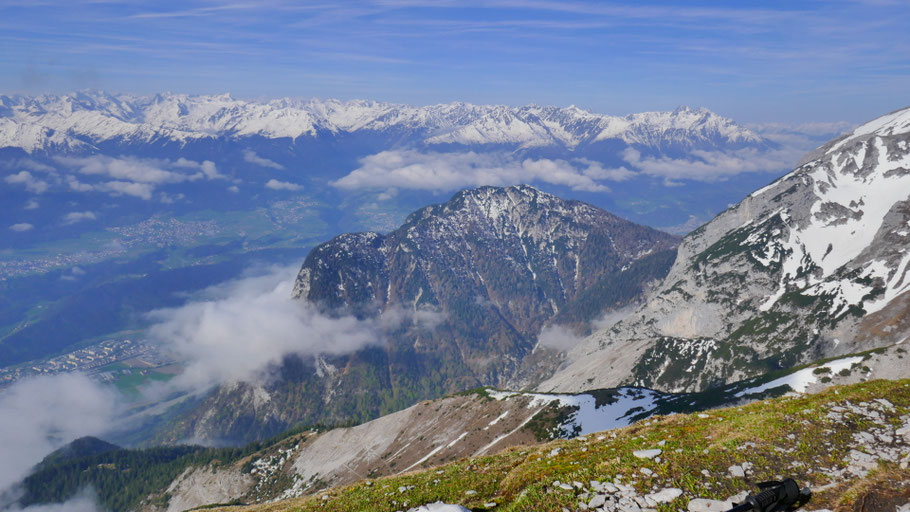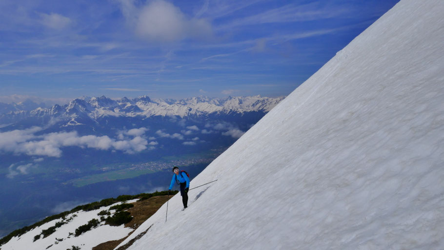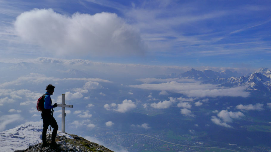 Eine der schönsten, zugleich ruhigen und einfach zu erreichenden Aussichtswarten über Innsbruck ist das Brandjochkreuz (2268 Meter). Der kleine Kammausläufer der Brandjochspitzen bietet einen sonnigen Anstieg, der wie in unserem Fall Ende April schön früh großteils schneefrei ist. Vom Gramartboden (ca. 860 m) weg führt der Pfad dabei auf steilen Wegen direkt auf den Achselkopf (1506 m), zur Achselbodenhütte (1645 m) und dann über den Südostanstieg auf das Brandjochkreuz. Von hier geht es, wie von Jürgen schon beschrieben, am anspruchsvollen Südgrat zur Vorderen Brandjochspitze.