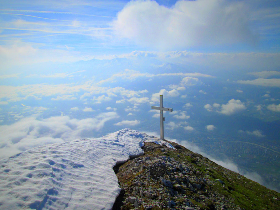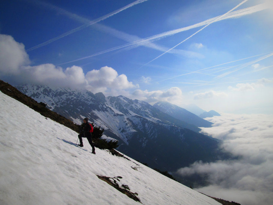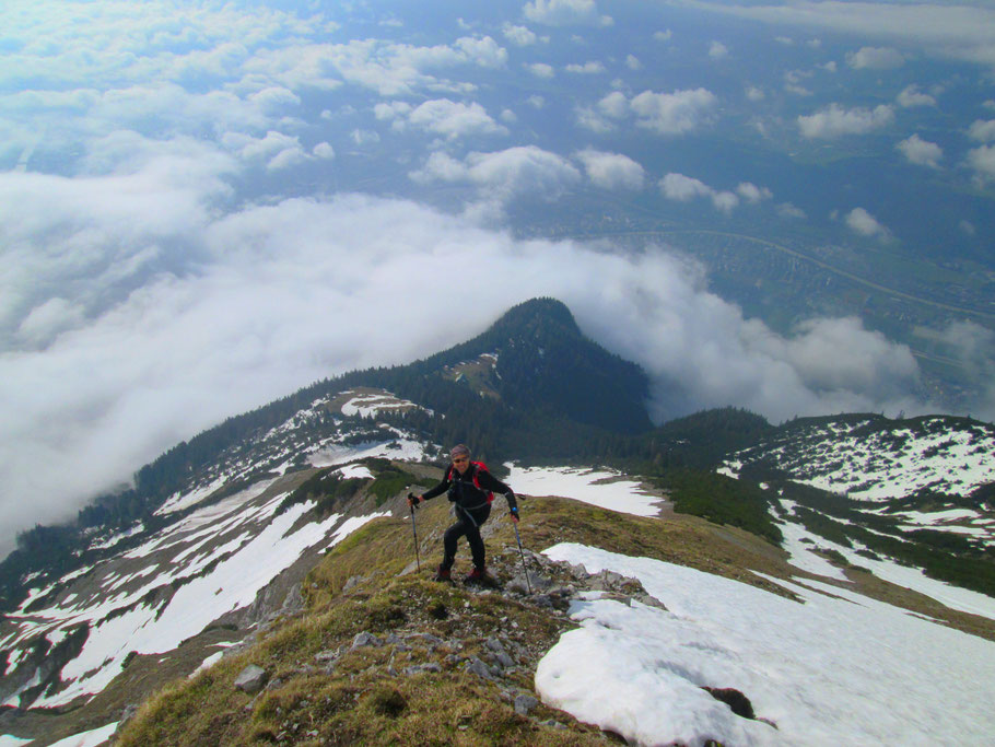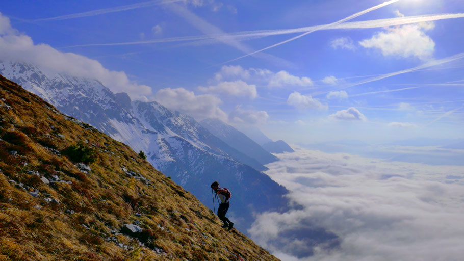 Roman über dem Hochnebel am direkten Weg zum Brandjochkreuz (2280 Meter).