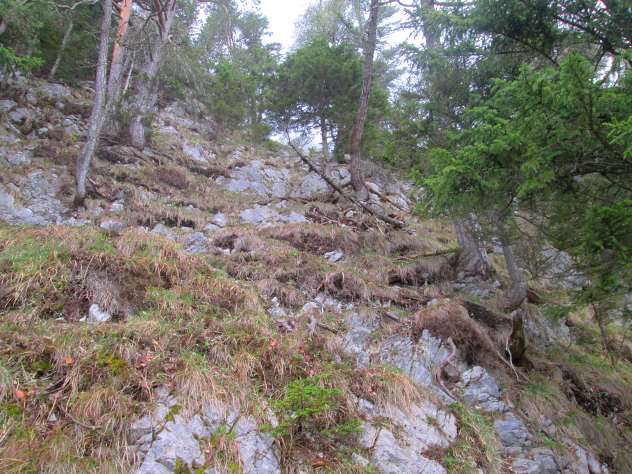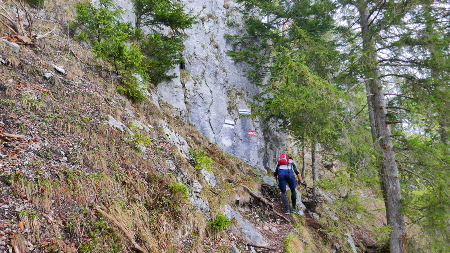 Bei diesem Felsen hier teilen sich die Wege zum Achselkopf - links unser Weg über steileres Gelände (T4+), geradeaus