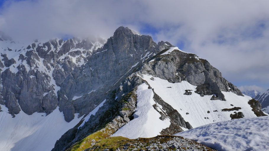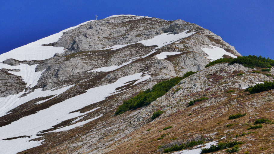 Brandjochkreuz mit der schneefreien SO-Kante, die wir nehmen.