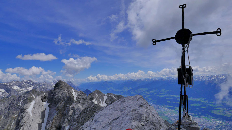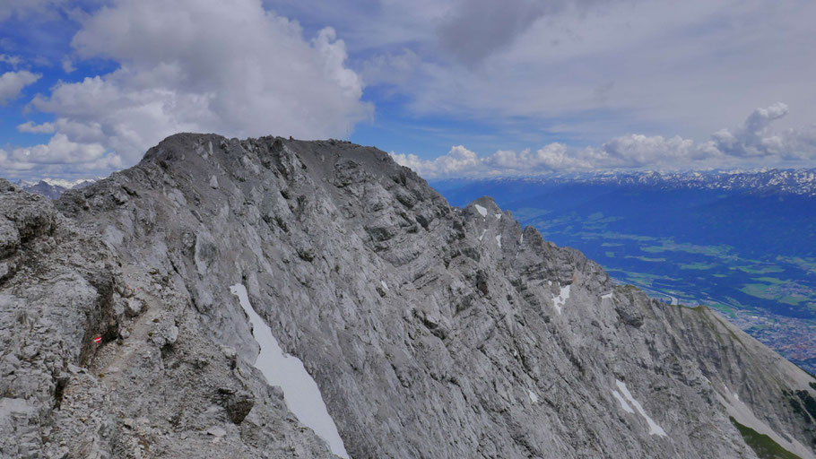 Trailrunschuhe aus, klettertaugliche Bergpatschen an - los geht das Vergnügen. Der Südgrat wird beworben und dementsprechend oft begangen, meist aber von der Höttinger Alm (wie ich damals mit MTB-Zufahrt) oder von der Seegrube mit Bahnunterstützung.
