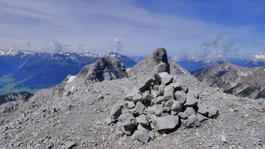 Am Sattel zwischen dem sehenswerten Kleinen (im Hintergrund) und dem unscheinbaren Großen Solstein. Hier wieder Umsatteln auf Laufschuhe, von hier sind's noch satte 1.900 Höhenmeter zurück nach Kranebitten auf spannenden Steigen, für die ich nochmals etwas mehr als 2 Stunden brauchen werde.