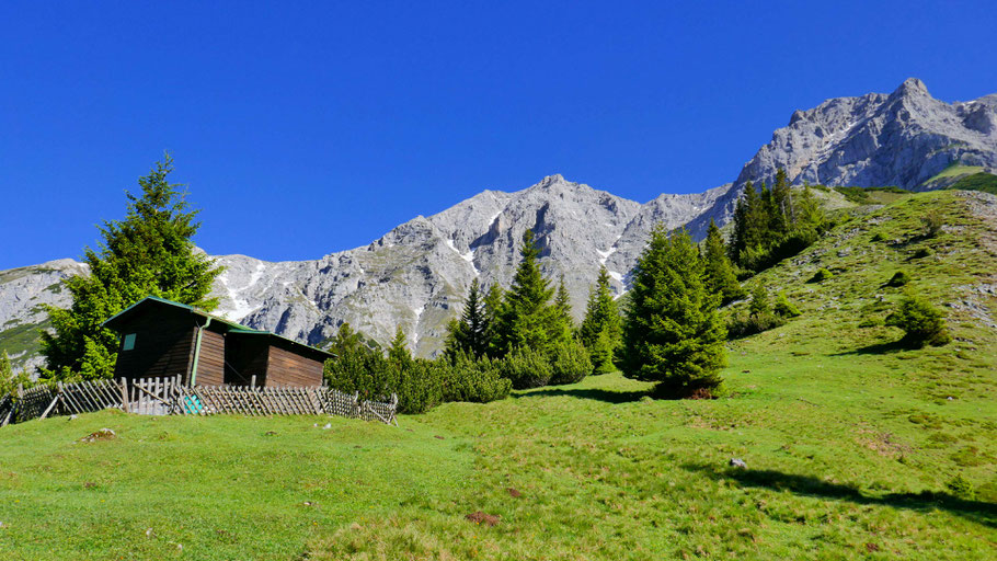 Jagdhütte Larchln (1.740m). In Bildmitte der Kleine Solstein, rechts die Hohe Warte, die auch direkt über den Südgrat ersteigbar wäre (IV). Zwischen den beiden Gipfeln verläuft der Normalweg auf die Hohe Warte.