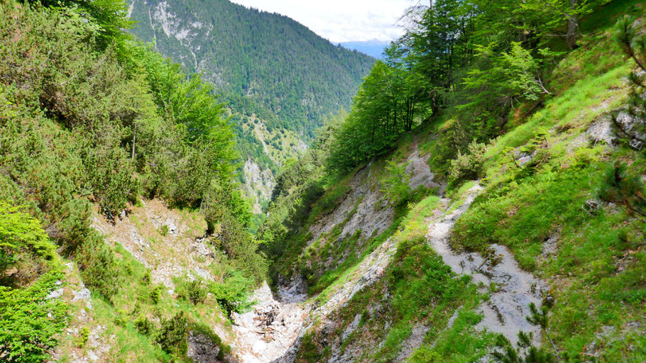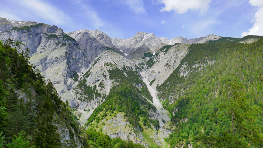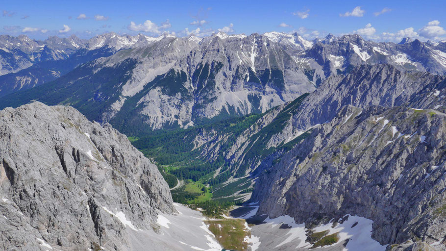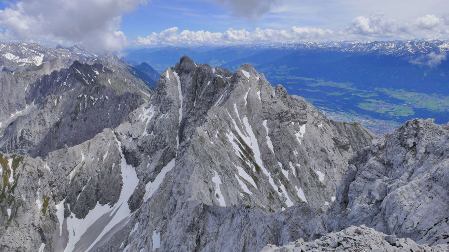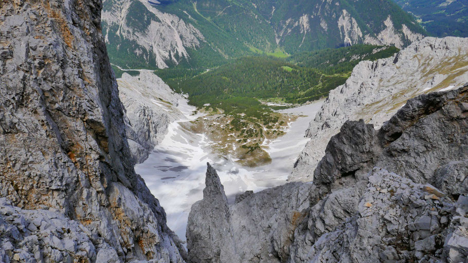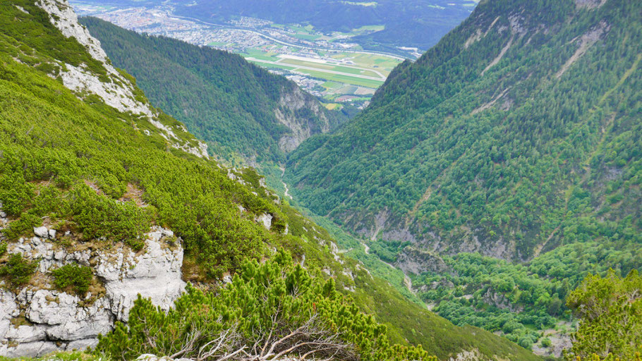 Tiefblick zum Hechenberg, auch eine schöne, abwechslungsreiche Überschreitung, davor die tief eingeschnittene Kranebitter Klamm, die ich beim Abstieg aus nächster Nähe bewundern darf.