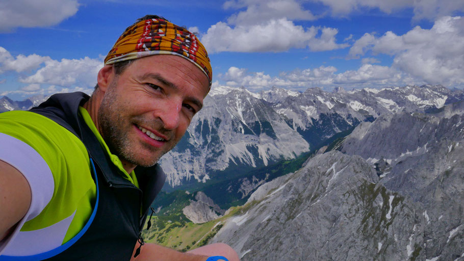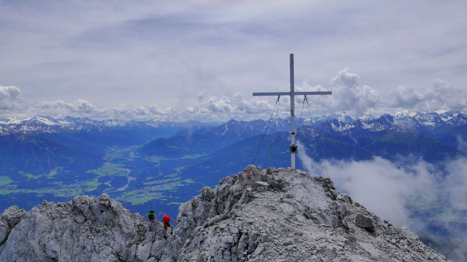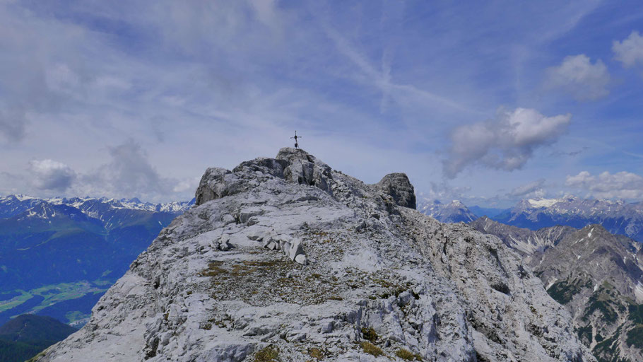 Am Gipfel der Hohen Warte (2.597m) hoch über Innsbruck, einem Zwischenziel auf dem langen Grat zwischen Brandjochspitzen und Solstein.