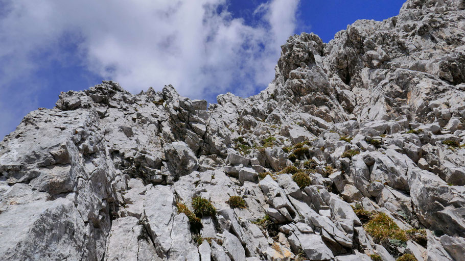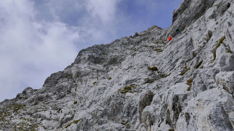 Danach steiler aufwärts. In Summe auch hier recht brüchiges Gelände, gewürzt mit IIer Stellen.