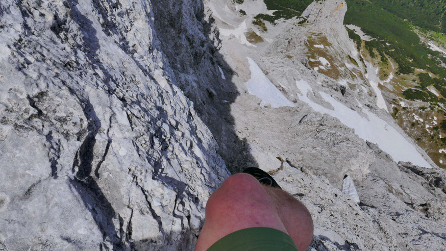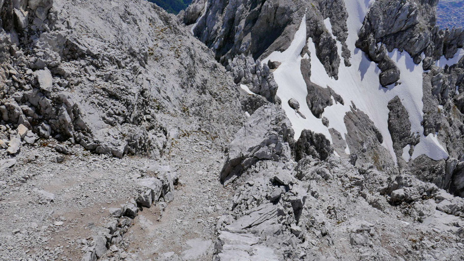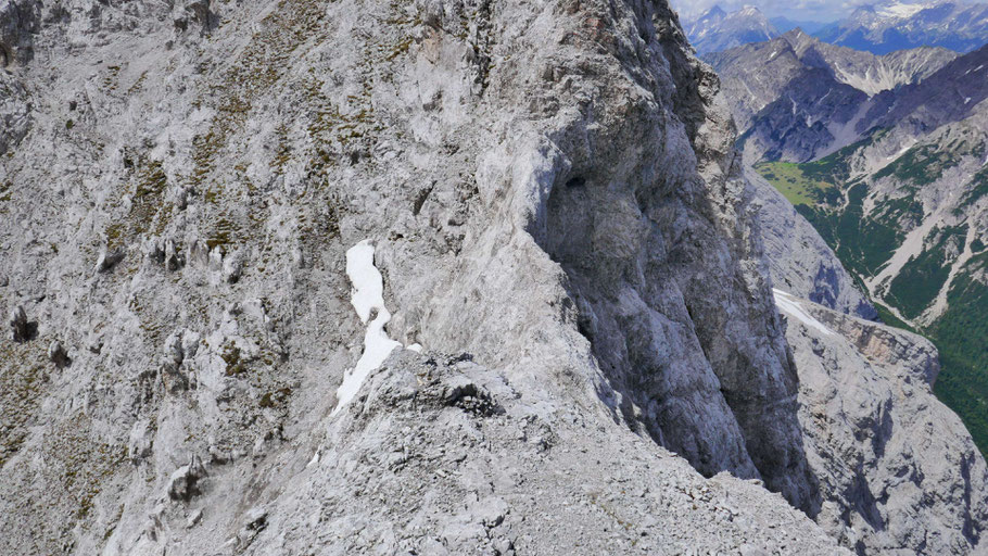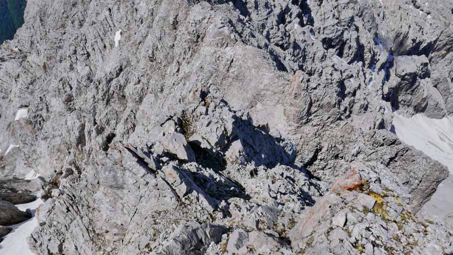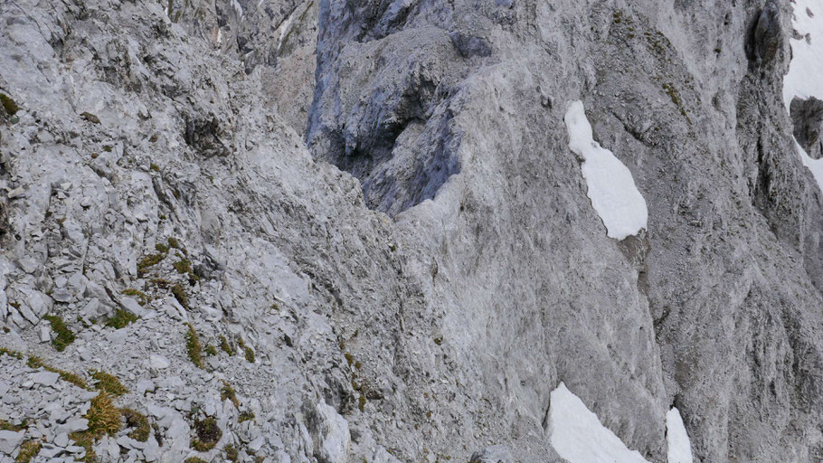 Bei der Erstbegehung habe ich die ideale Stelle zum Queren etwas suchen müssen. Bin etwa auf Höhe des Schneeflecks ausgesetzt gequert (II), so erspart man sich weitere 30-40 Höhenmeter Abstieg und kommt exakt auf Höhe der Scharte heraus. Das direkte Abklettern scheint doch deutlich schwieriger zu sein, habe ich aber nicht getestet.