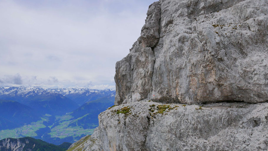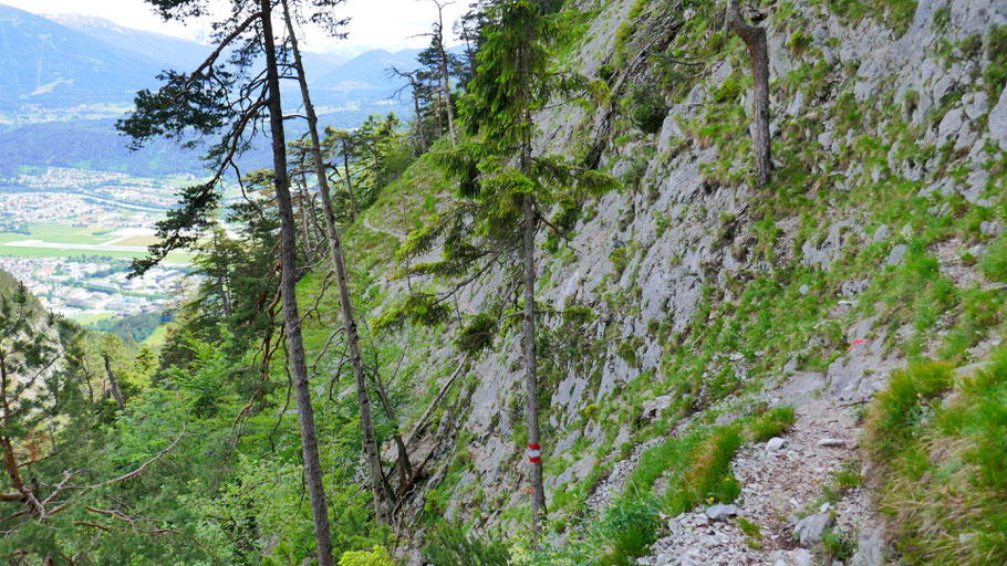 Rückblick auf die Felswände, entlang derer der empfehlenswerte Höttinger Schützensteig verläuft.