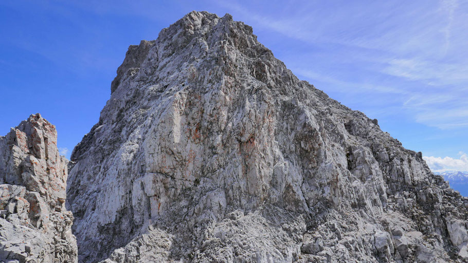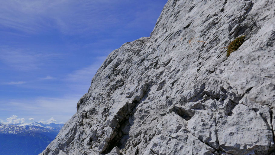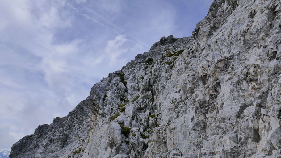 So kommt man zurück auf den Grat, die letzte Steilstufe wird auf einem südlich ausgerichteten Teilstück erklommen (II).
