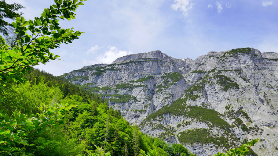 Ein wunderbarer Frühlingstag, alles in sattem Grün. Nach der Aspachhütte wird der Steig steiler, auf ca. 1.700m ein schöner Blick hinauf zu Hoher Warte, Brandjochspitzen und Brandjochkreuz.