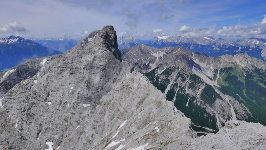 Nach Norden in das innere Karwendel, vorne u.a. der Gr. Katzenkopf (2.531m), unten das Frau-Hitt-Kar. Links die Hippenspitze (2.388m), die man leider von der Inntalkette aus nicht erreichen kann.