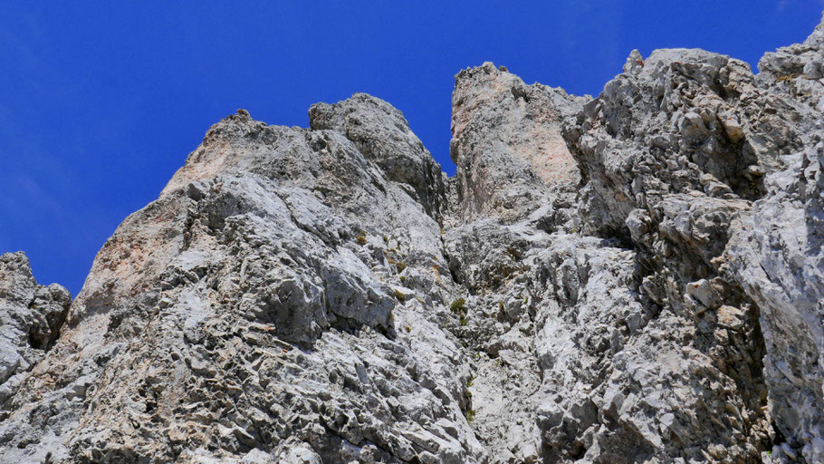 Etwas brüchig und steiler hinein in die Rinne (II-). Achtung auf losen Schotter, generell kam mir vor, dass die Felsqualität von Osten nach Westen schlechter wird.
