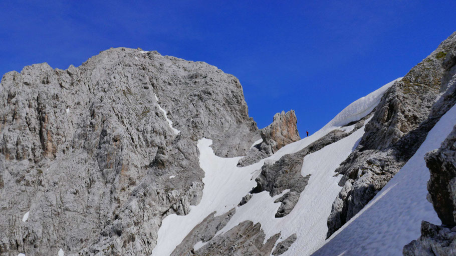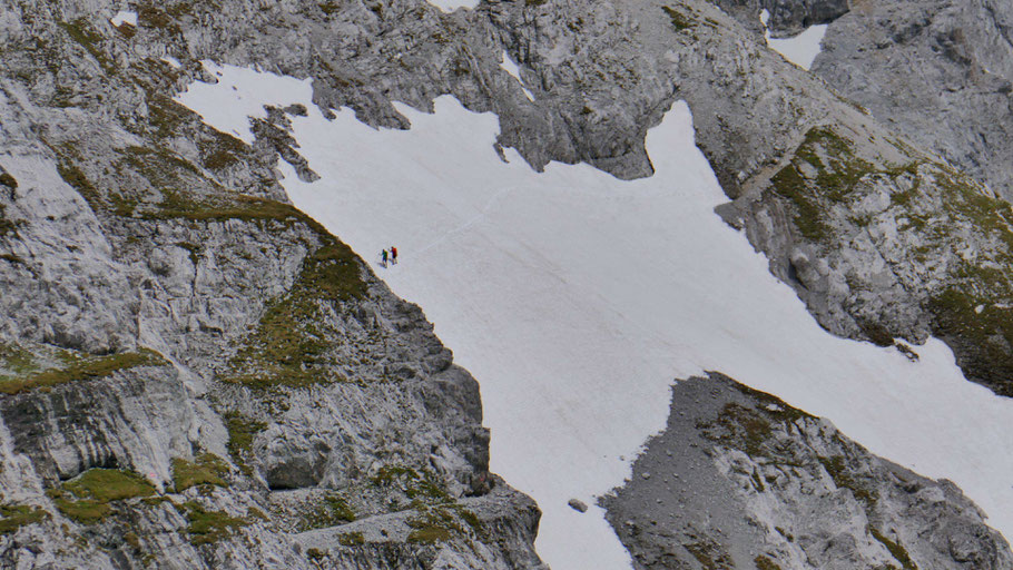 Im Abstieg gibt's noch ein paar größere Schneefelder, die hier von Nachfolgenden gequert werden.