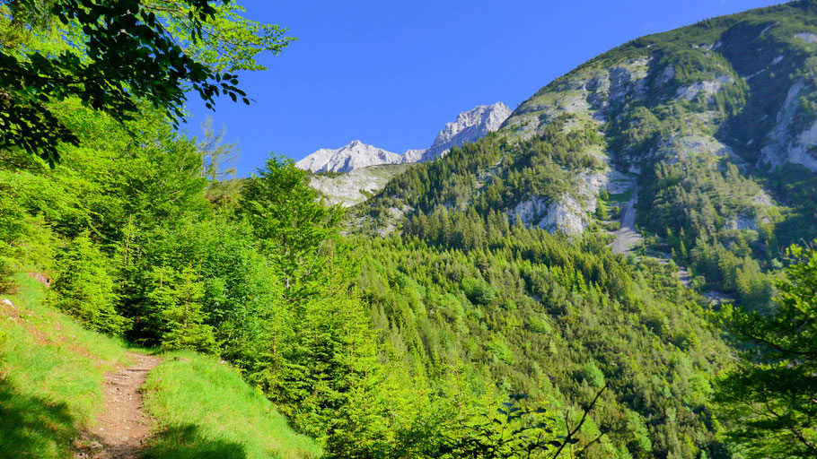 Am schönen Steig weiter aufwärts, erster Blick zu den späteren Gipfelzielen.