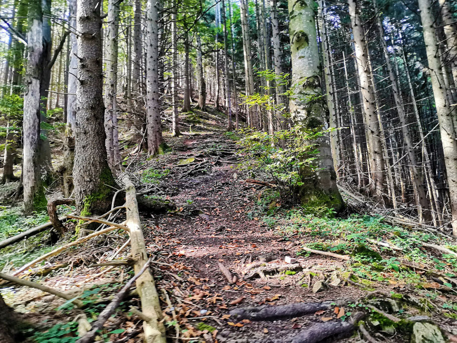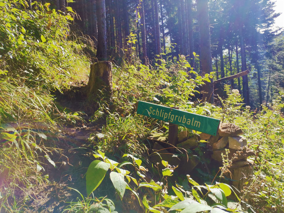 Ein kleines Schild weist mir den Weg in Richtung Schlipfgrubalm - entlang der steileren Hänge bahne ich mir den