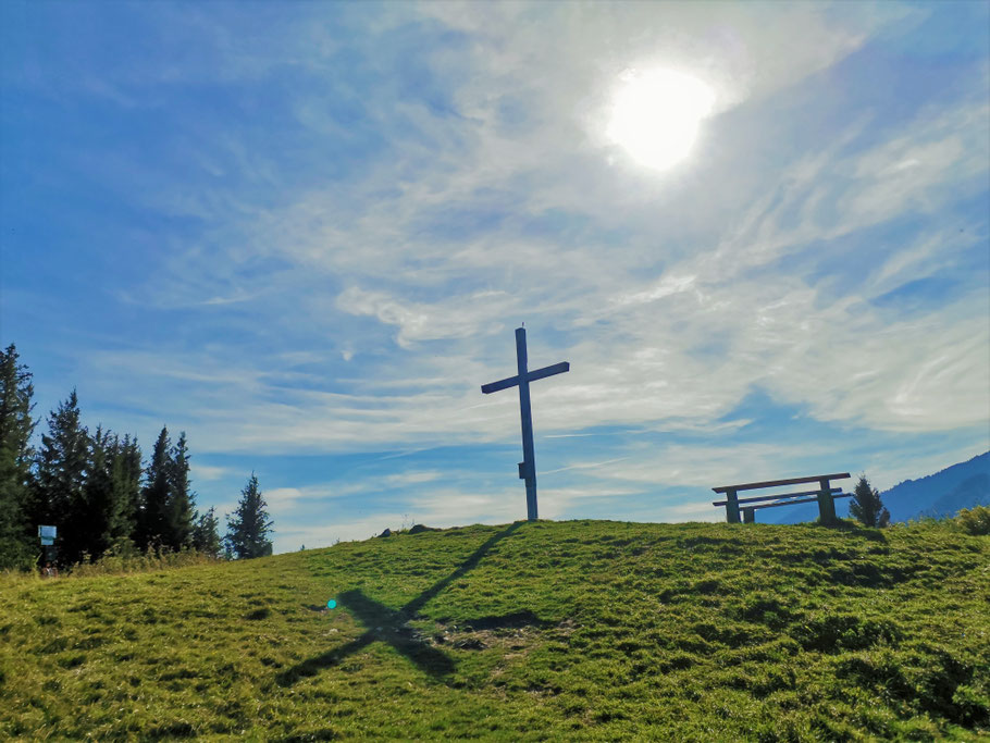 Das Gipfelkreuz mit dem Bankerl zum Verweilen und Sinnieren.