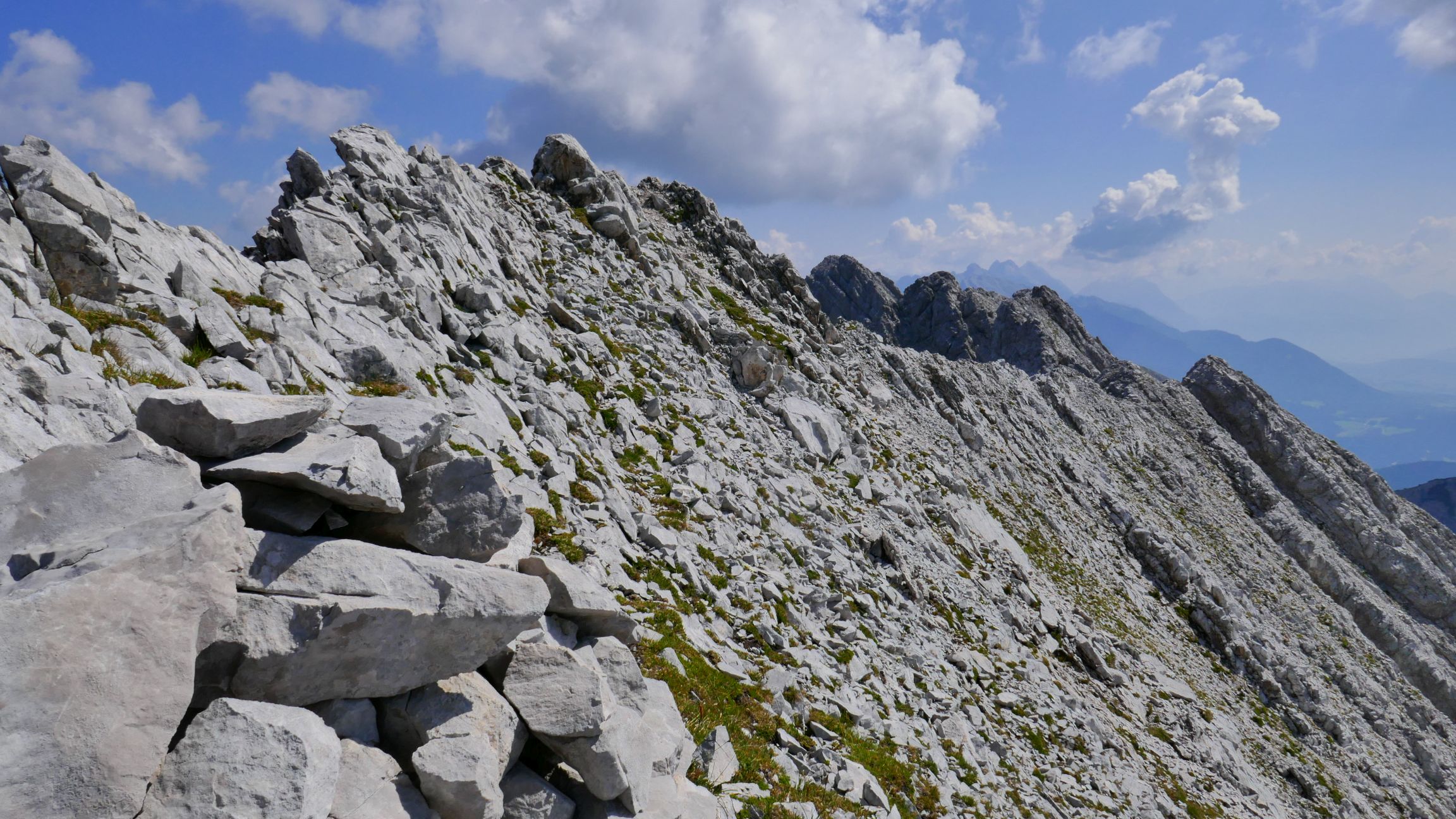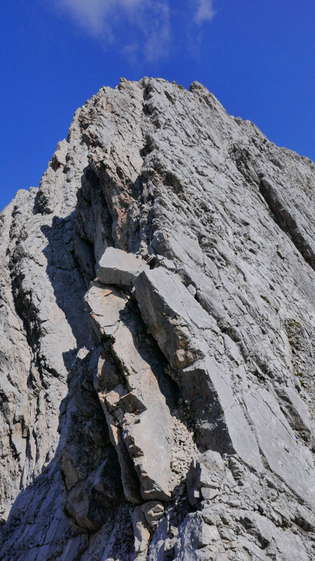 Der Ostgrat ist nicht besonders lang, ich brauche trotz 2 kleiner Verhauer nur 35 Minuten ab der Scharte, insgesamt ca. 1:30h von der Heiterwandhütte und etwas über 4h von Obtarrenz.