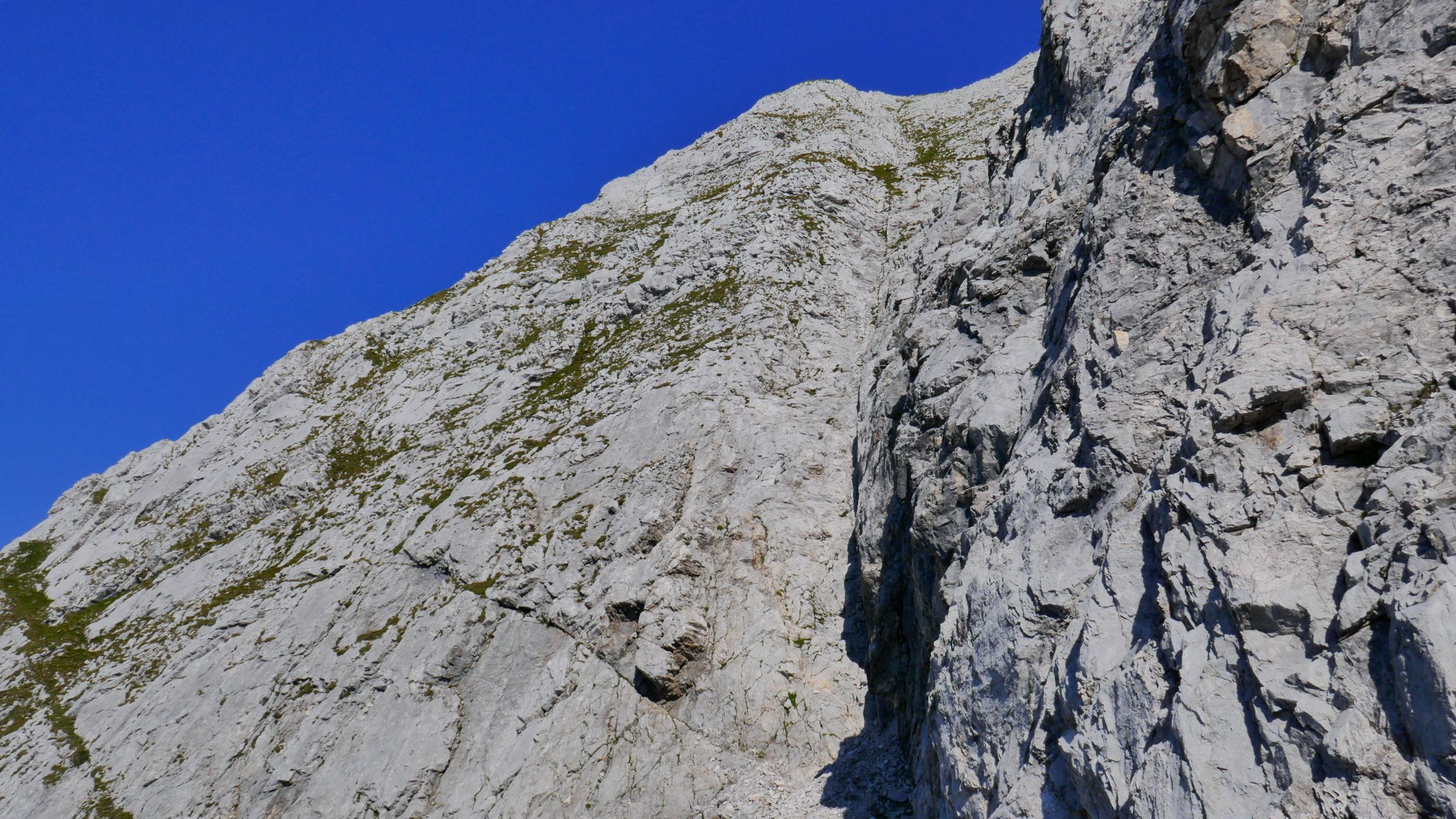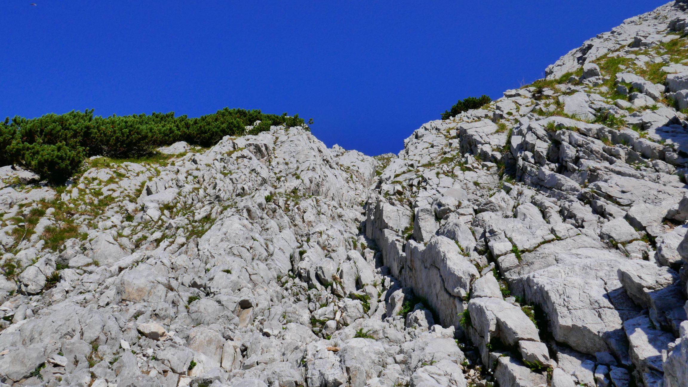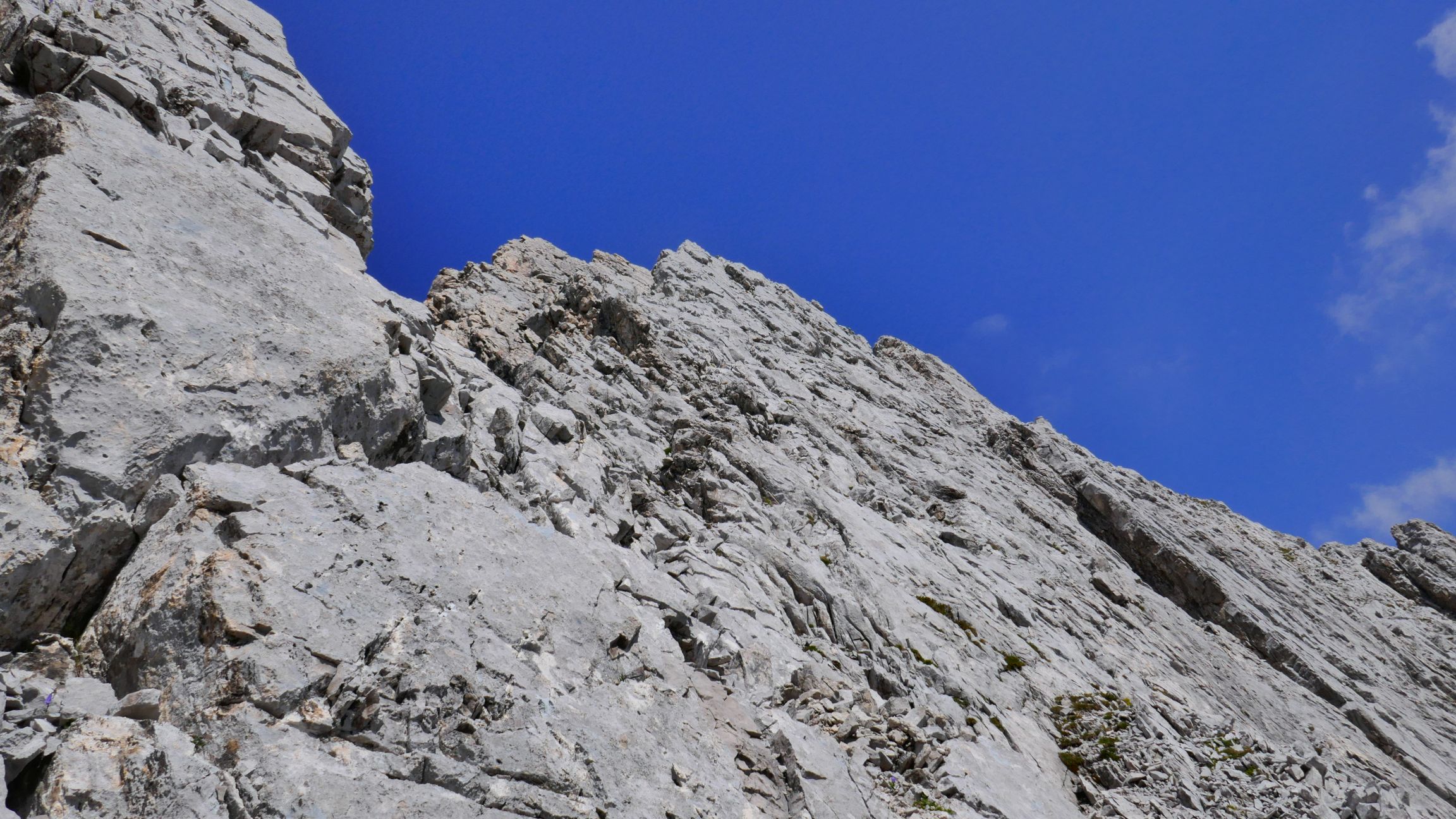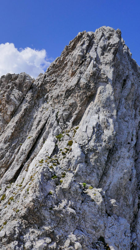 Einfach in eine erste Scharte hinunter (I+), danach schrofig wieder rauf.