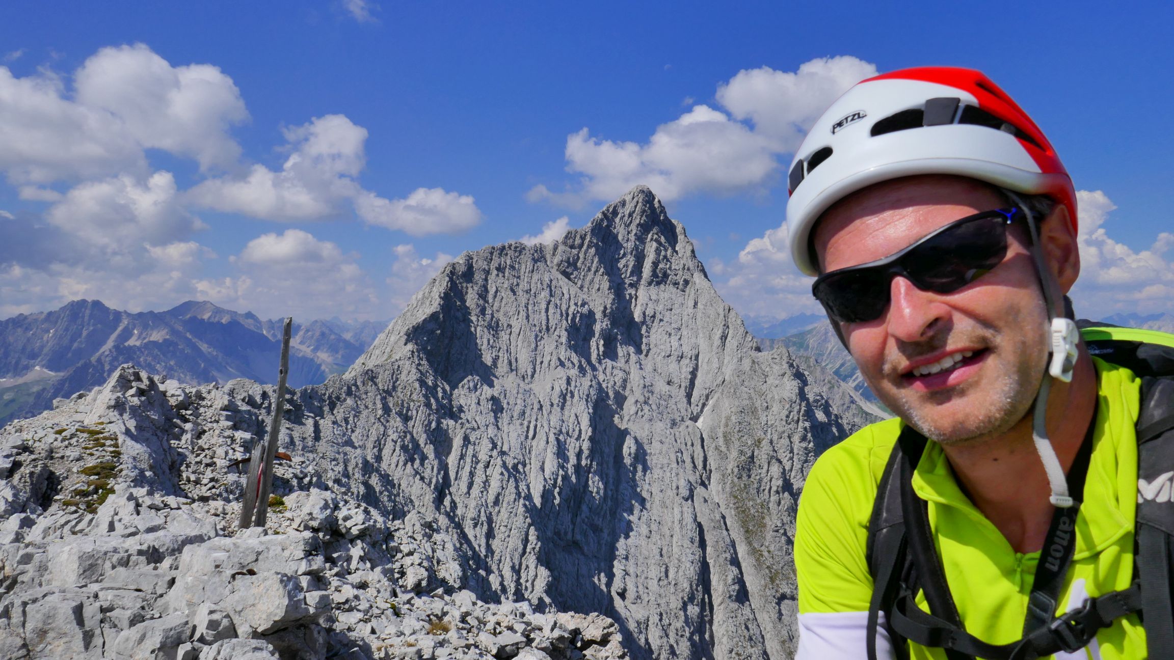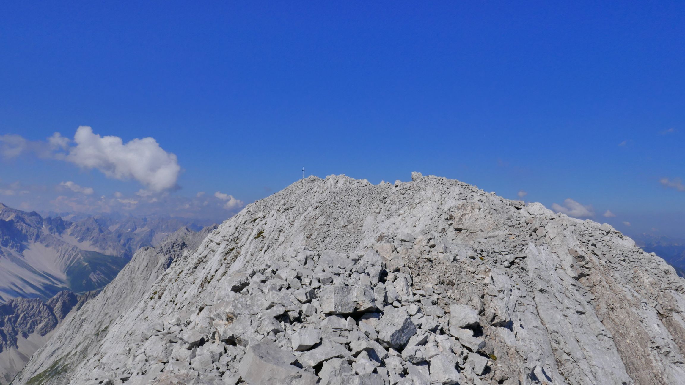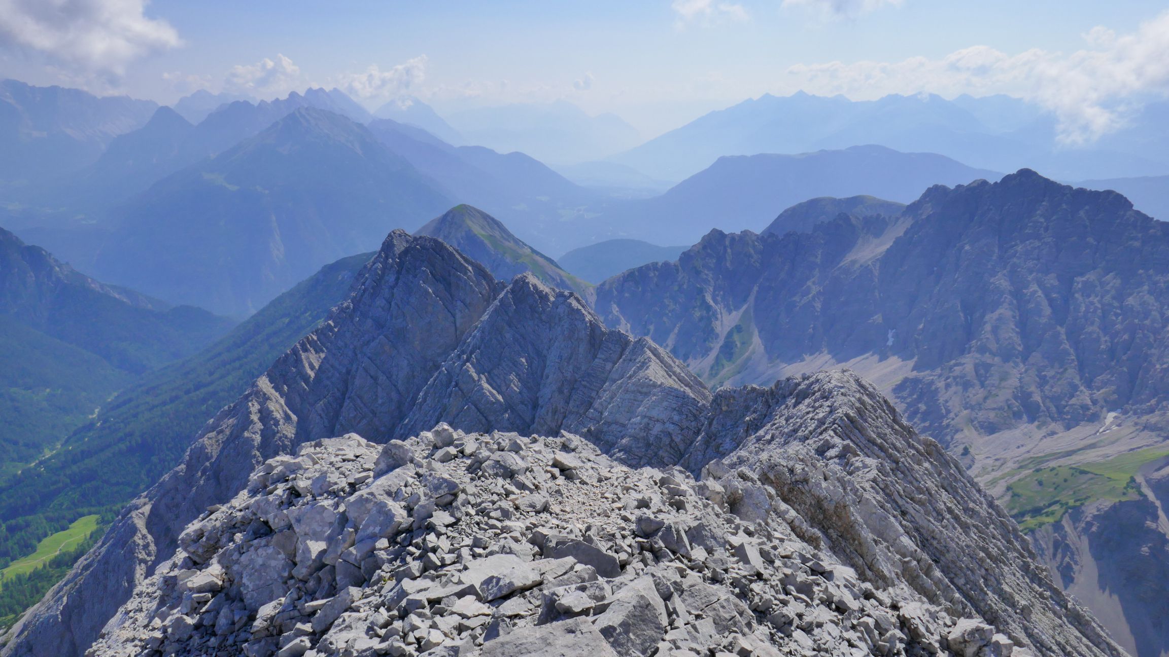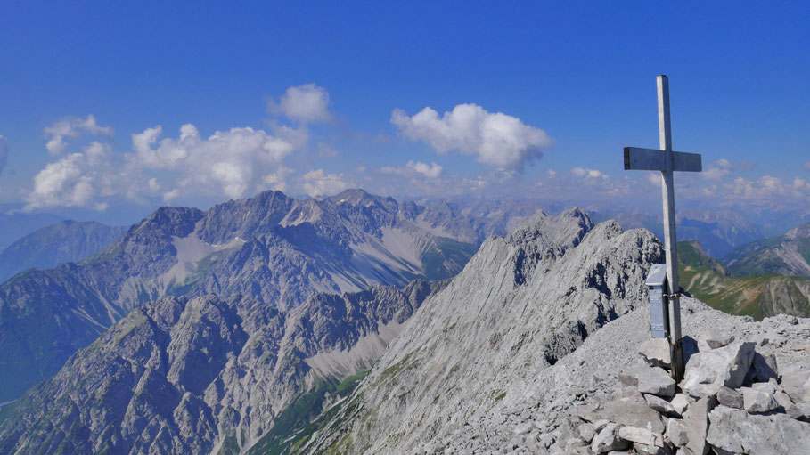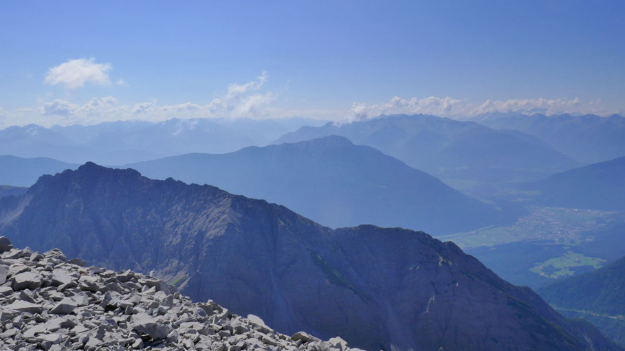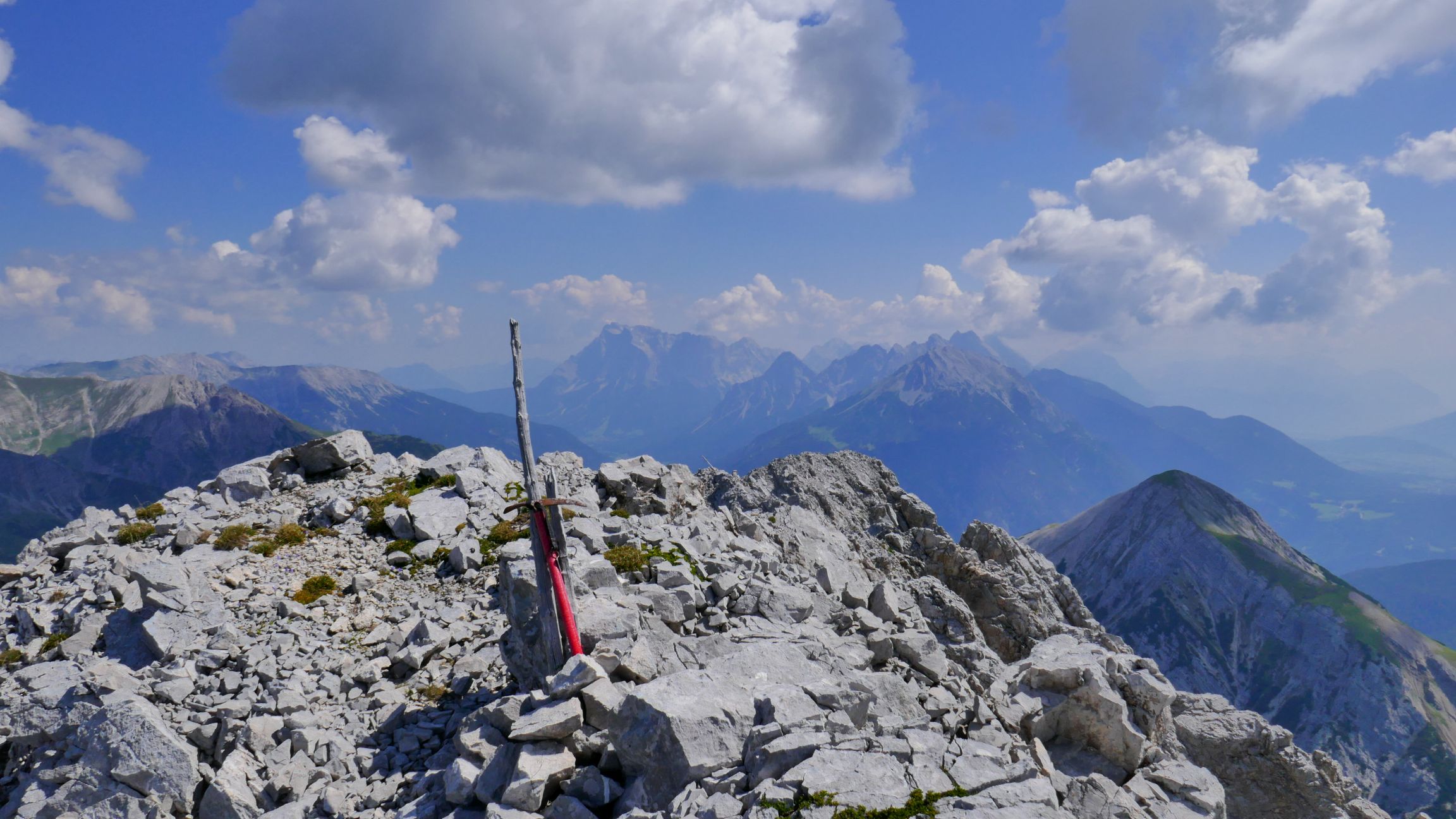 ... und gelangt nach wenigen brüchigen Metern zur mit einem verrosteten Pickel verzierten Gipfelstange (2.471m). Faszinierender Blick nach Osten in die Mieminger und ins Wetterstein.