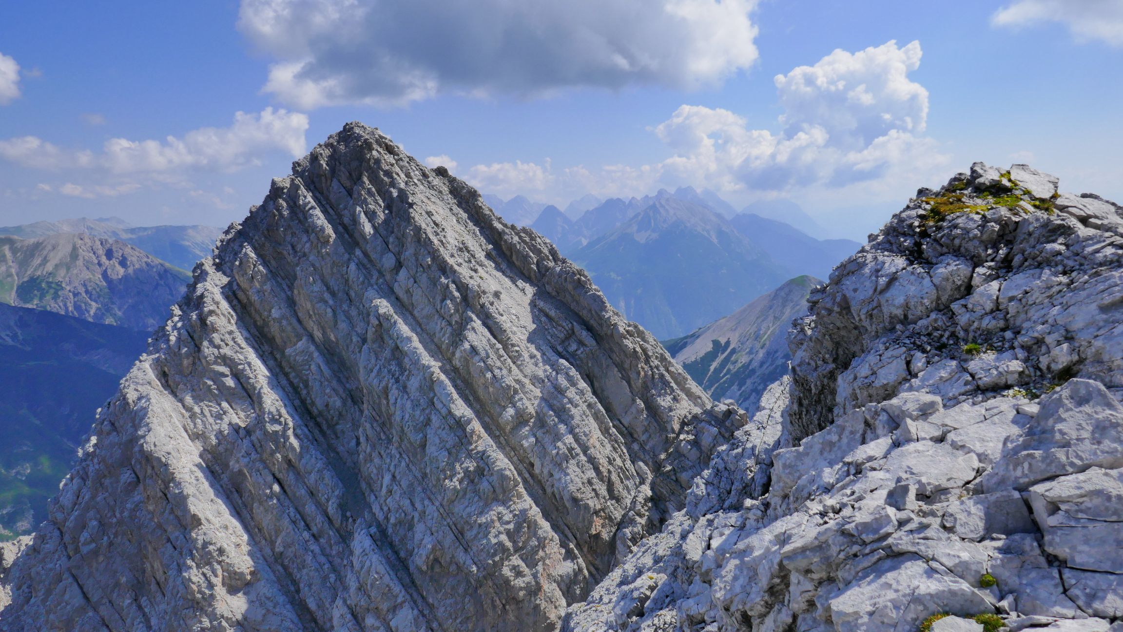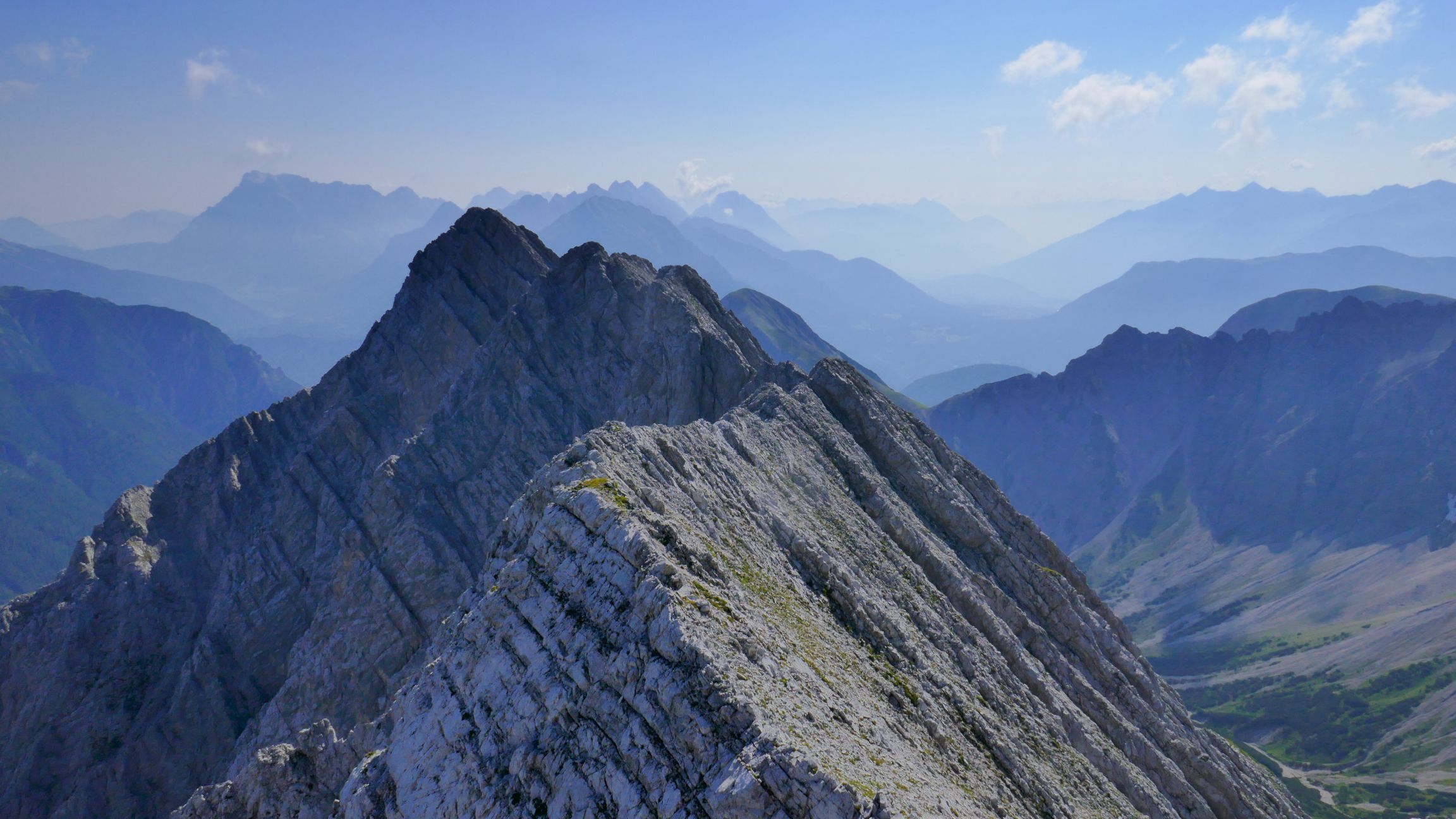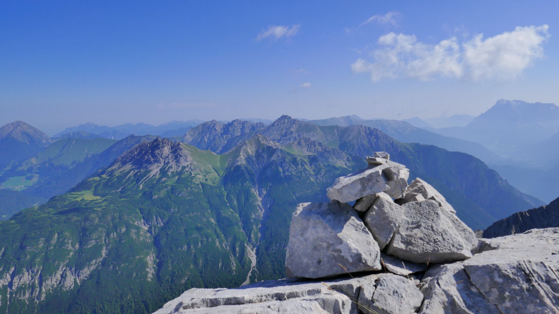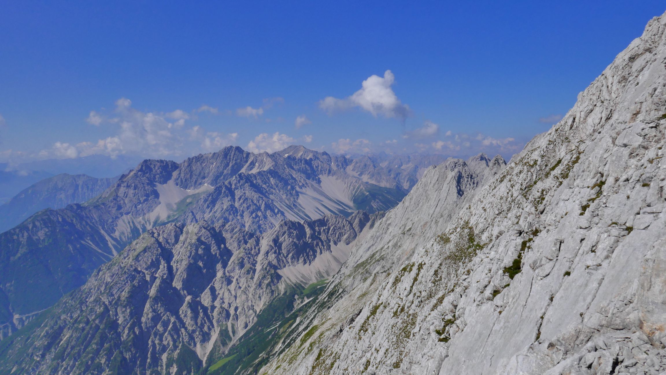 ... und gelangt nach wenigen brüchigen Metern zur mit einem verrosteten Pickel verzierten Gipfelstange (2.471m). Faszinierender Blick nach Osten in die Mieminger und ins Wetterstein.