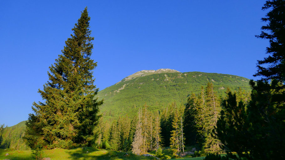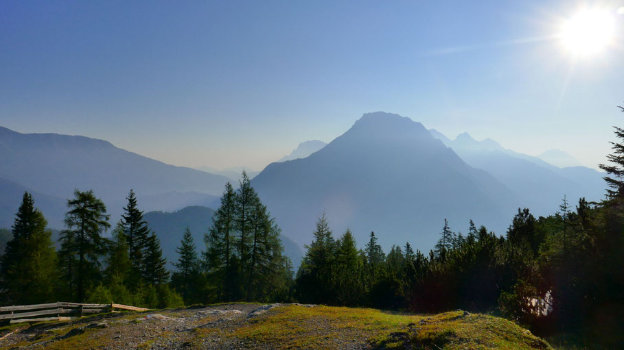 Wunderschönes Wandern am frühen Morgen bei noch angenehmen Temperaturen. Rechts das schnuckelige Sinnesegg, im Hintergrund der Tschirgant (2.370m). Dieser Berg war einer der Startpunkte meiner "Bergkarriere".