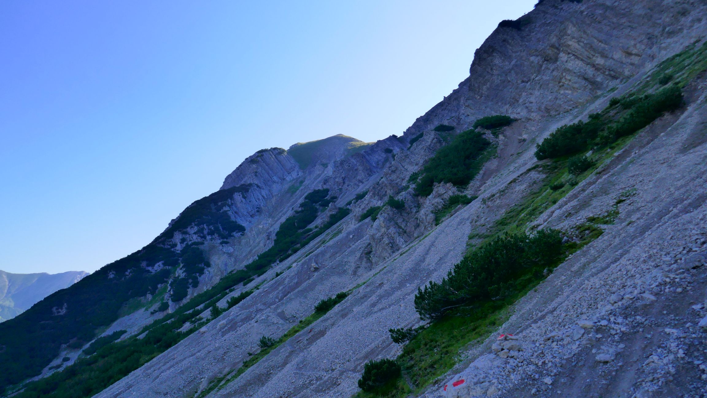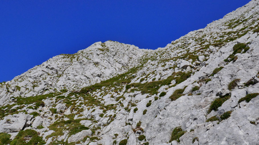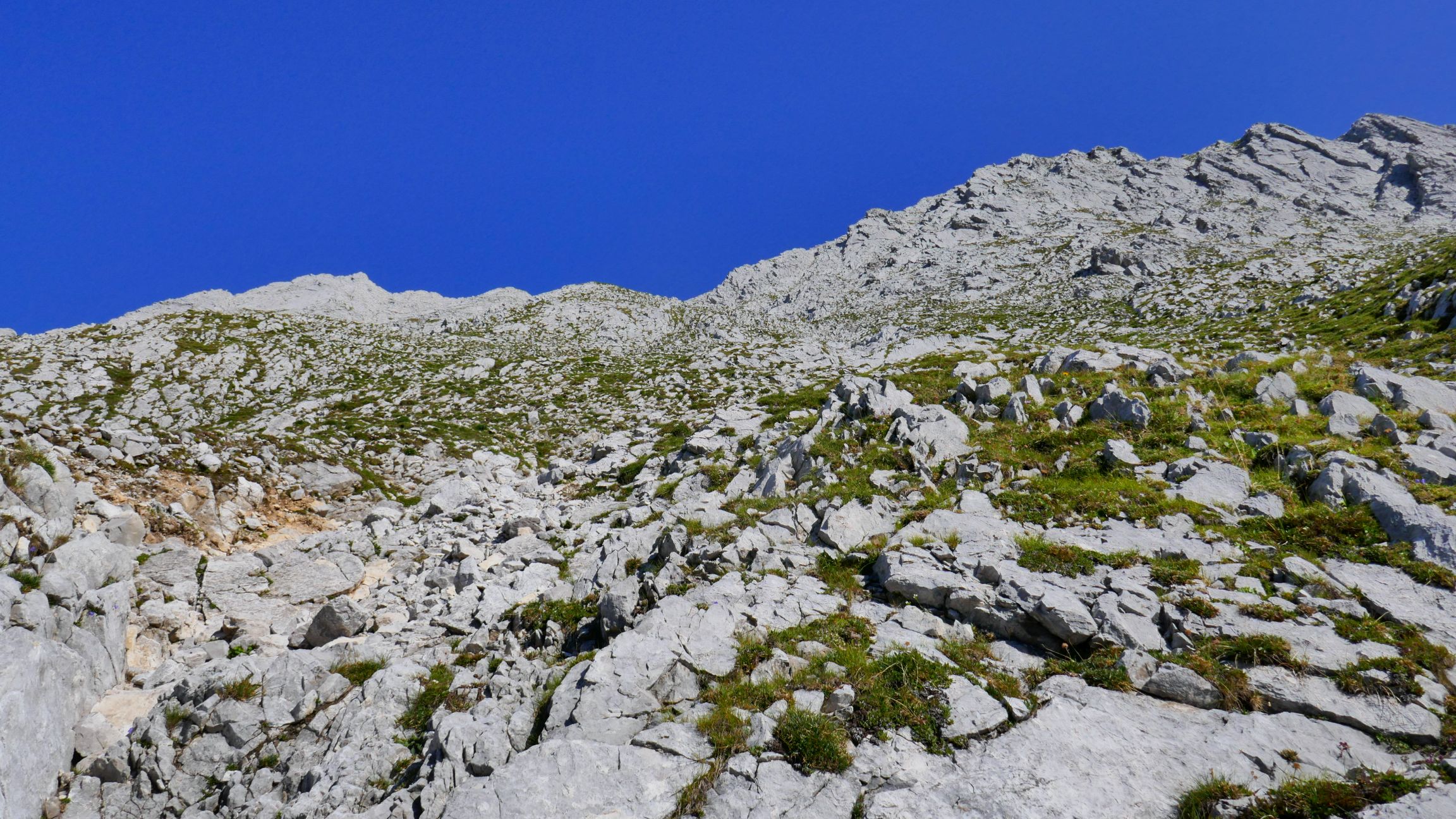Von der Hütte präsentiert sich die Südflanke als Gemisch aus Schrofen und Rinnen. Ich wusste, dass man einen Schuttkegel hochsteigen muss zu einer Rinne. Auf diesem Bild ist es der wenig sichtbare Schuttkegel links der Bildmitte. Wegweiser oder Markierungen finden sich hier nirgendwo.