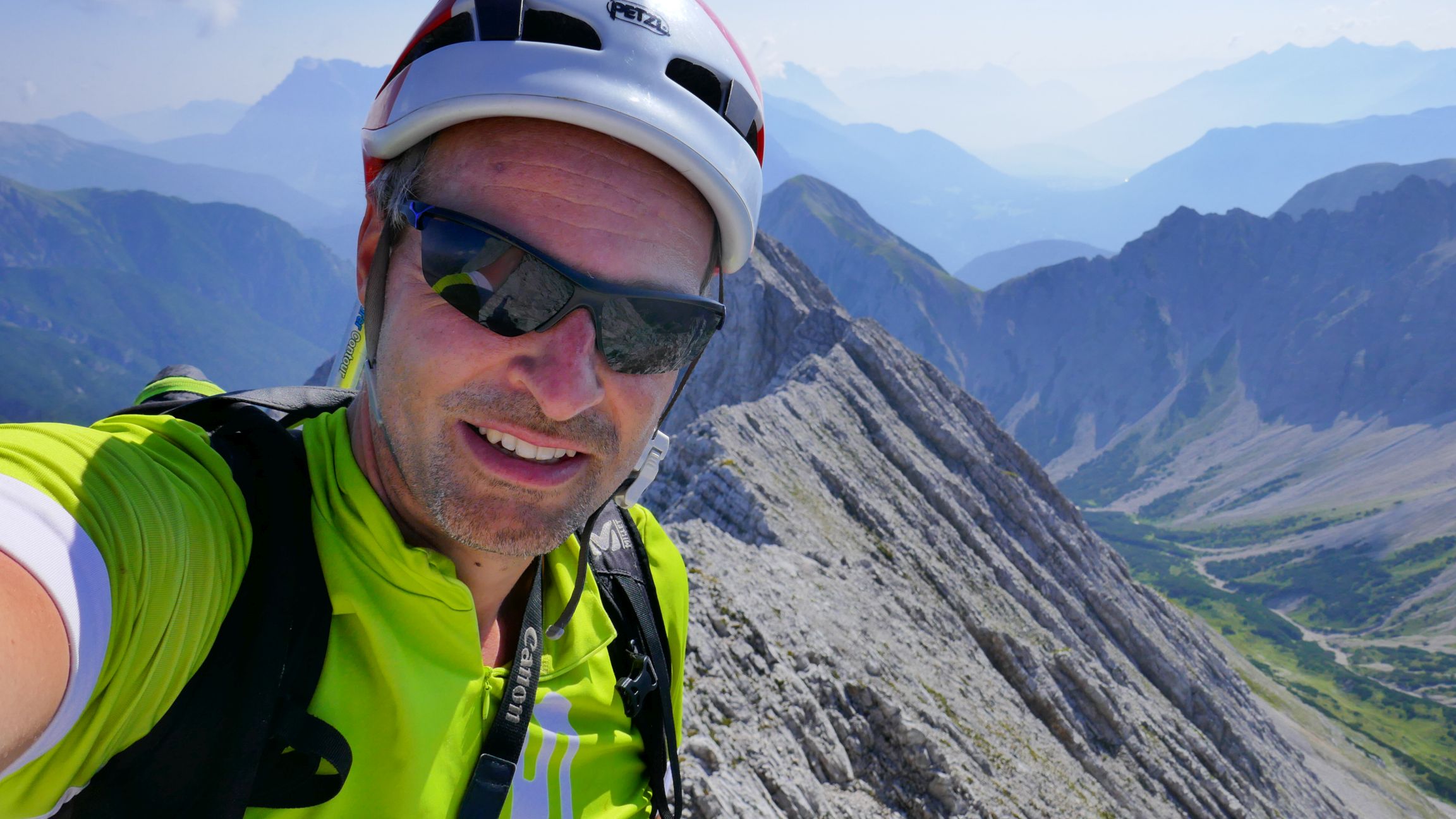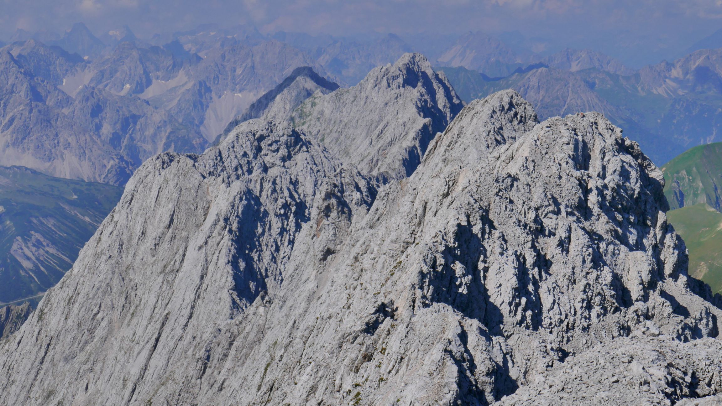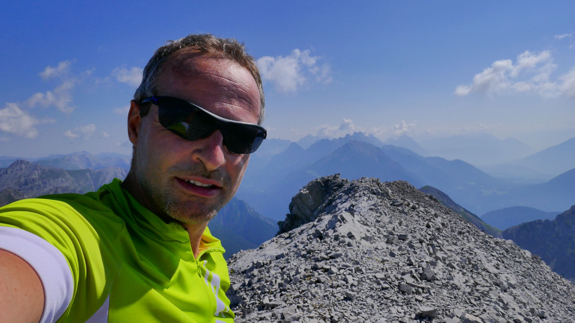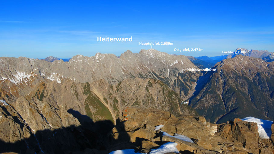 Am Hauptgipfel der Heiterwand (2.639m), dem höchsten Punkt der 8 Kilometer langen Felsmauer in den Lechtaler Alpen. Der Gipfel hat rund 20-25 Begehungen pro Jahr, ein paar Unentwegte wagen die Gesamtüberschreitung. Vorne links die Vordere Platteinspitze, von der das nächste Foto aufgenommen wurde.