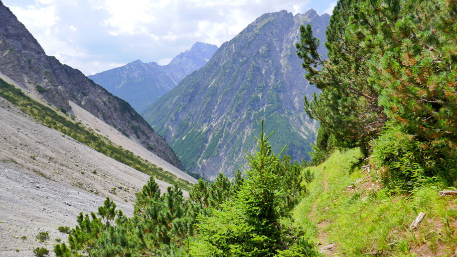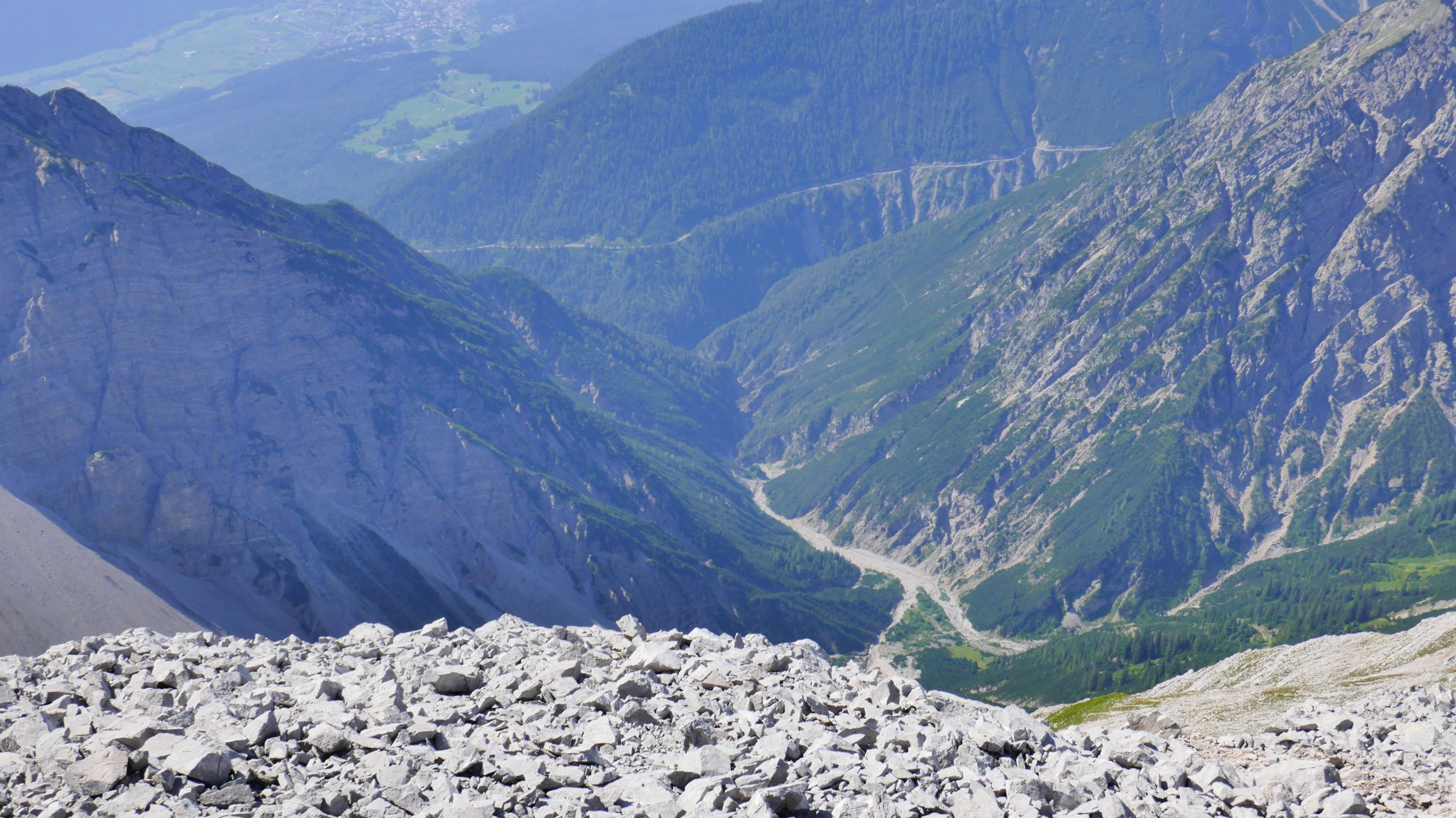 Tiefblick ins Alpeiltal, durch das ich später die Runde um den Rauchberg komplettieren werde. Dahinter erkennt man die gelegentlich hörbare Hahntennjoch-Paßstraße.