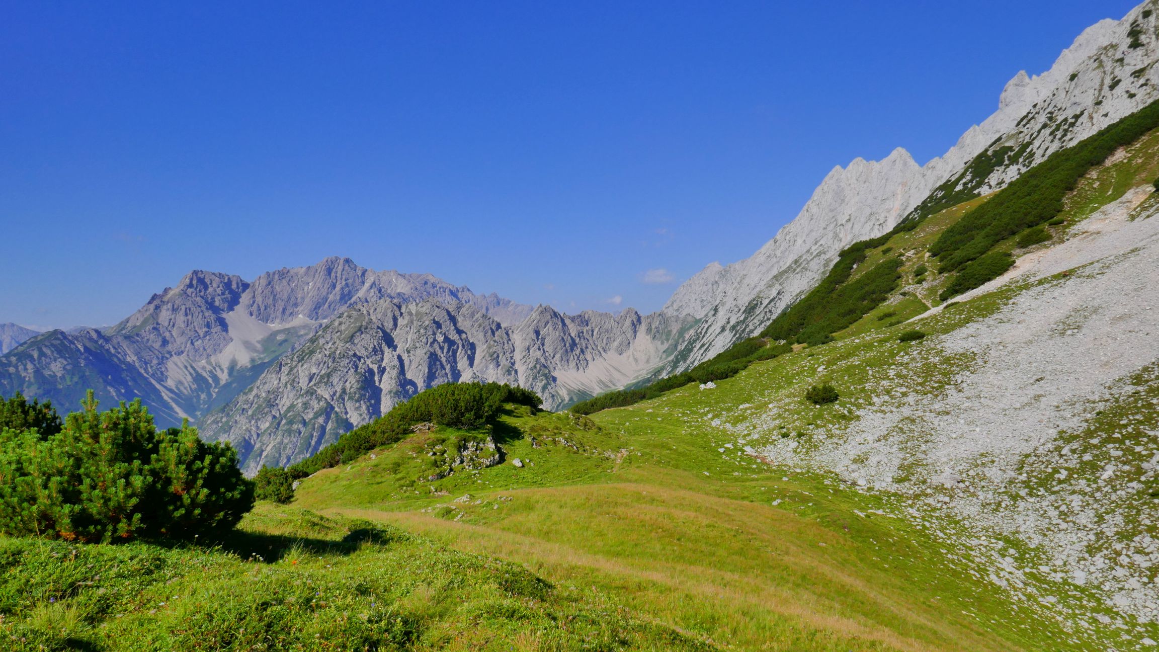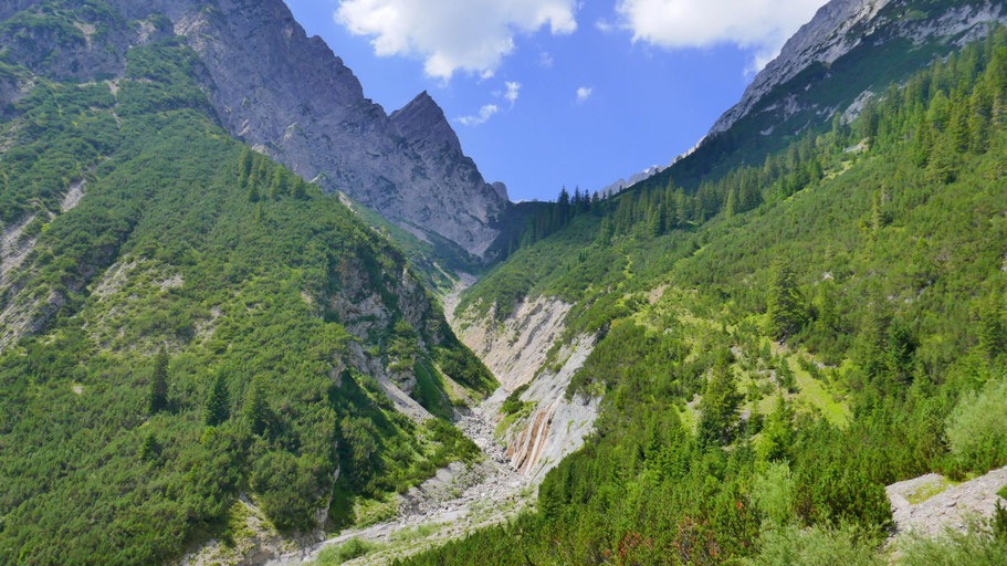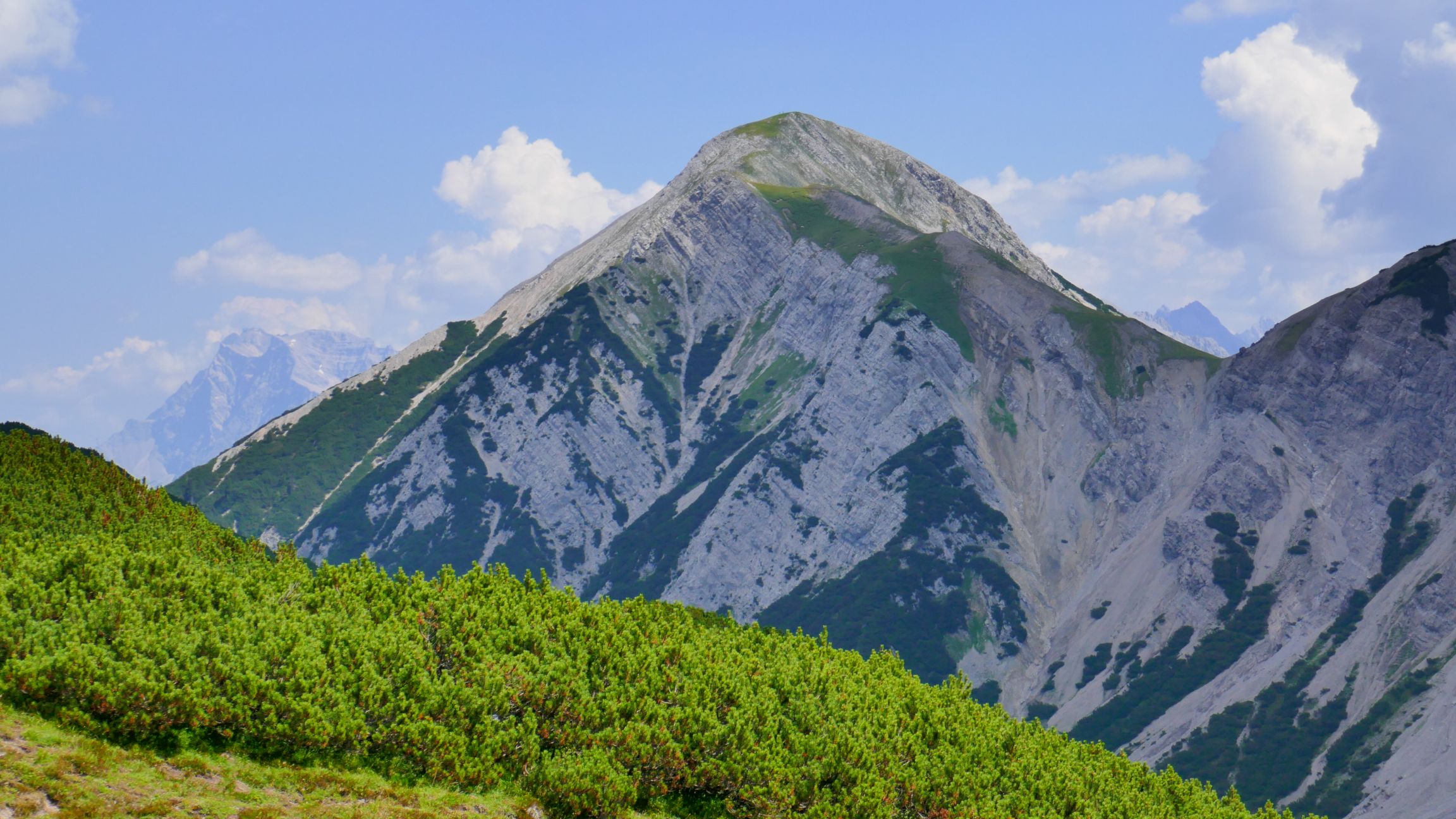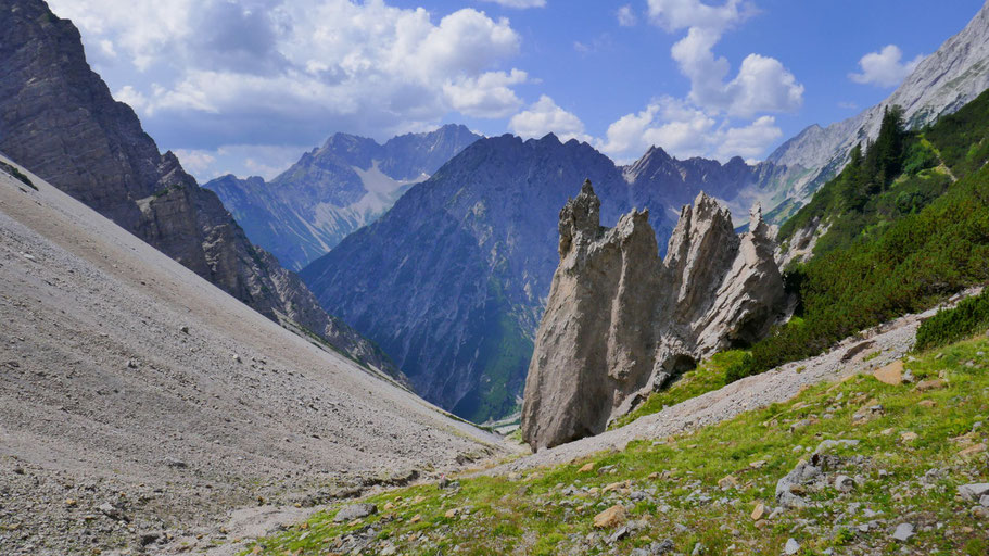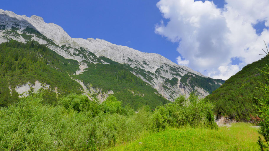 Kurz nach der Hütte öffnet sich auf einmal dieses gigantische Panorama nach Osten auf den Wannig (2.498m), links davon die Zugspitze (2.962m). Ich bin am östlichsten Punkt der Rauchberg-Umrundung.