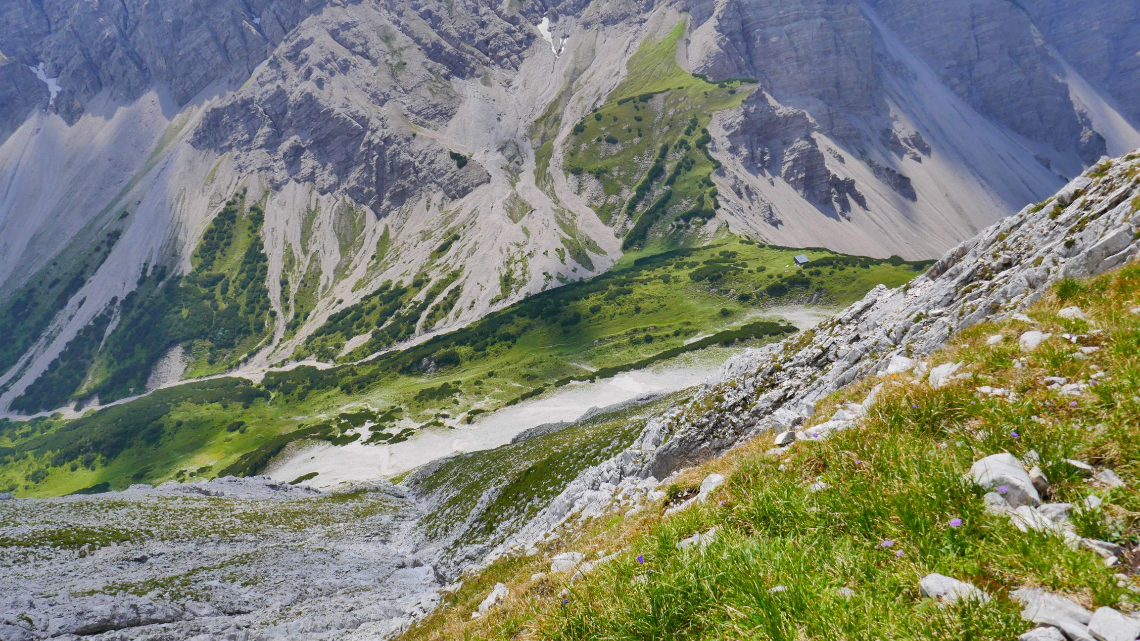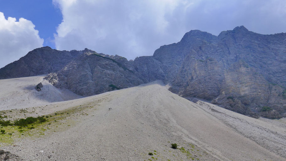 Zurück bei der Heiterwandhütte, der Abstieg (im Bild von rechts oben bis zur Rinne in Bildmitte) hat nur 45 Minuten gedauert und war sicher bedeutend schneller als mit dem Rückweg über die Scharte (die links oben zu sehen ist).