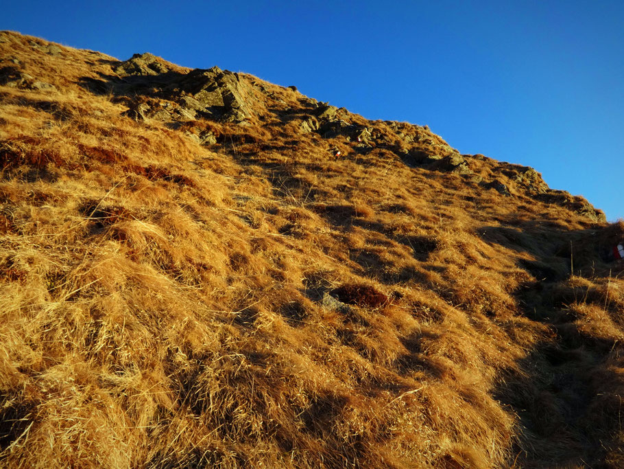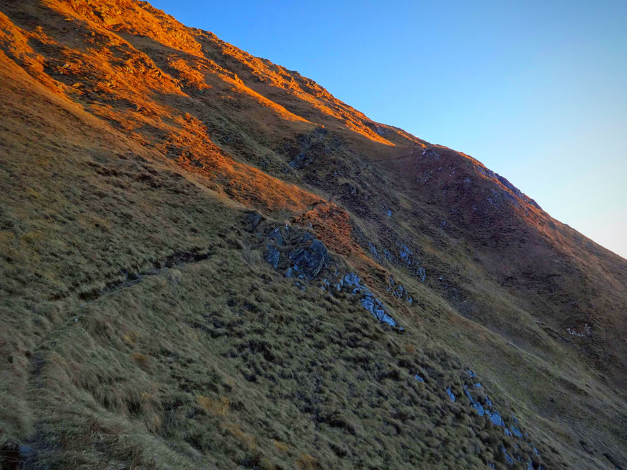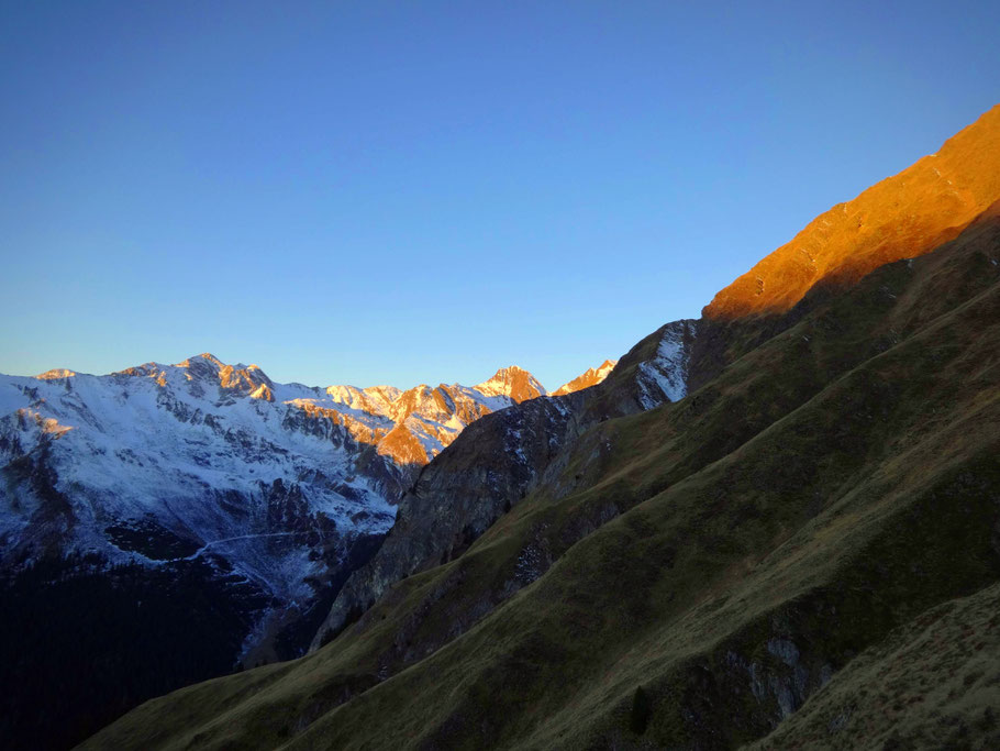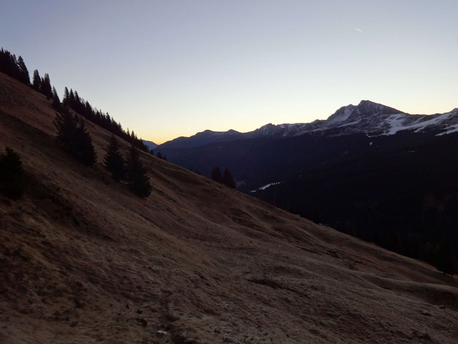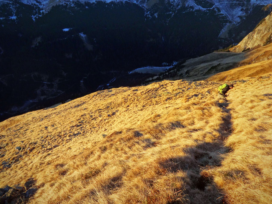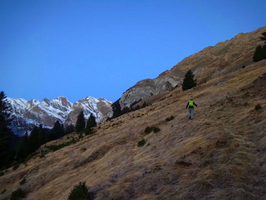 Nach dem ersten Anstieg im Dunkeln auf dem markierten, aber nicht beschilderten Weg kommt langsam Licht in die Sache. Vorsicht: Einstieg in die Tour ist gar nicht so einfach zu finden. Danach warten steile Wiesen im mittel schwierigen Gelände (T3+).