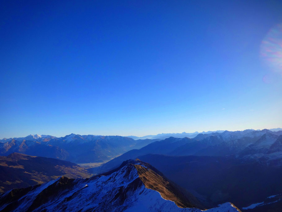 Im Süden zeigen sich die verschneiten Nordseiten der Ausläufer der Stubaier Alpen.