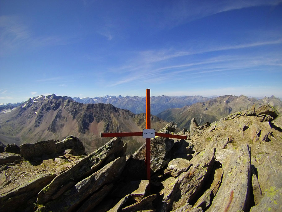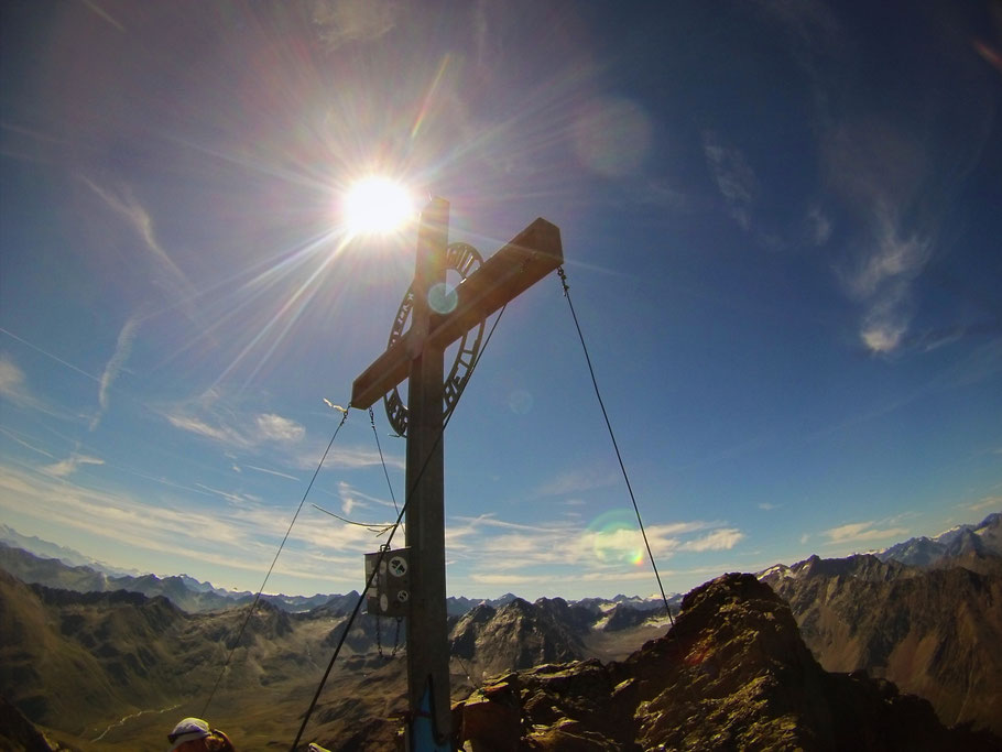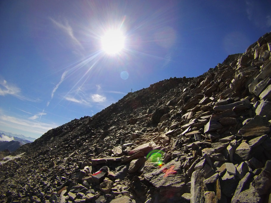Das etwas demolierte Gipfelkreuz des Gleirscher Rosskogel (2994 Meter).