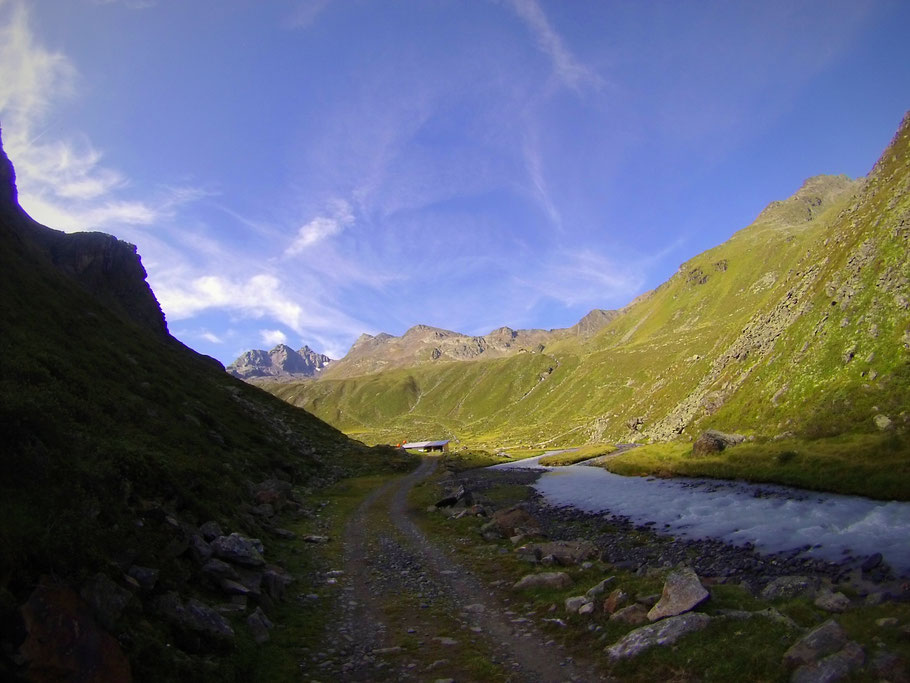 Die Bergtour beginnt früh morgens im beeindruckenden Gleirschtal. Wahlweise mit dem Mountainbike (teils sehr unebene Straße!) oder zu Fuß geht es über die 800 Meter flach bis zum kleinen Häuschen (hier zu sehen) unterhalb der Pforzheimer Hütte. Danach sind es noch gut 120 Höhenmeter im einfachen Gelände bis zur Hütte.