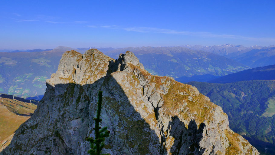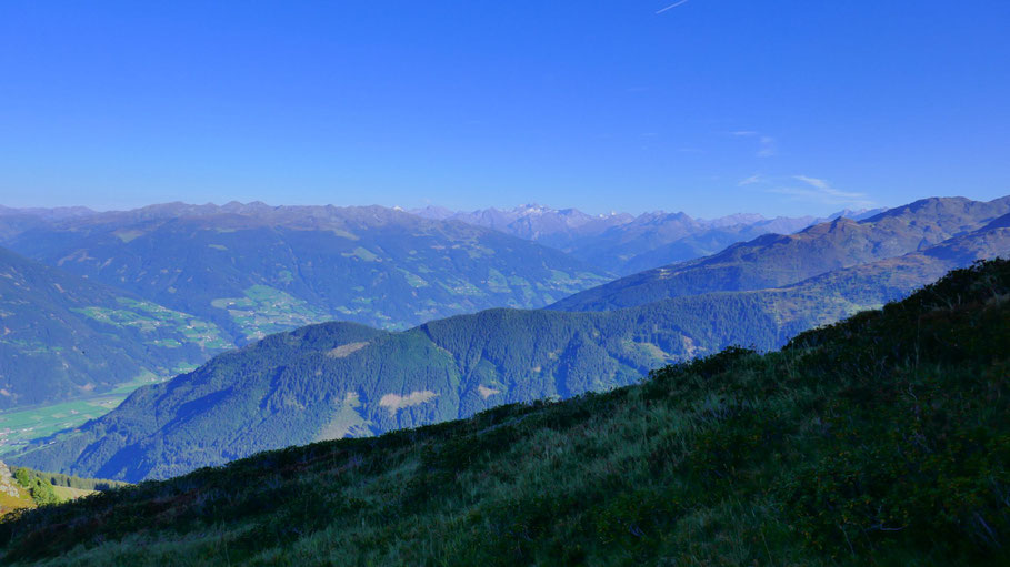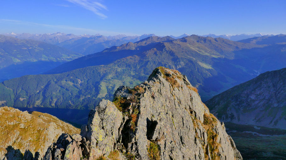 Beim Onkeljoch öffnet sich ein fantastischer Fernblick nach Südosten ins Zillertal und zur Reichenspitzgruppe.