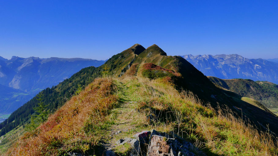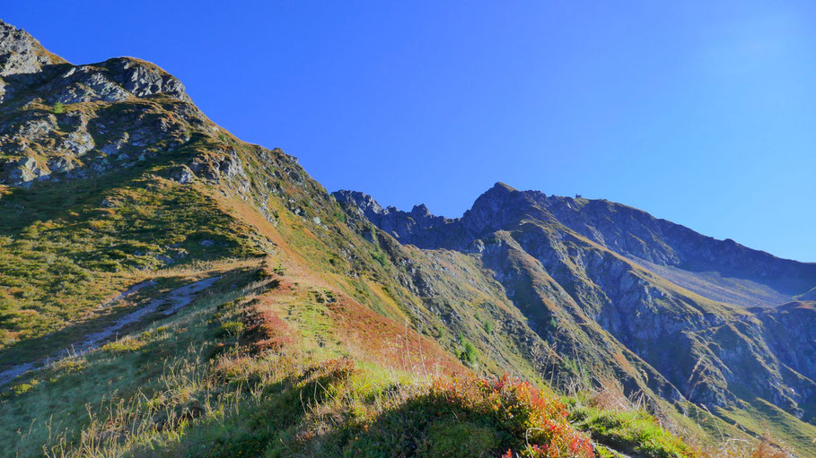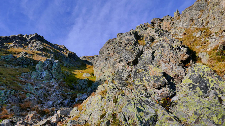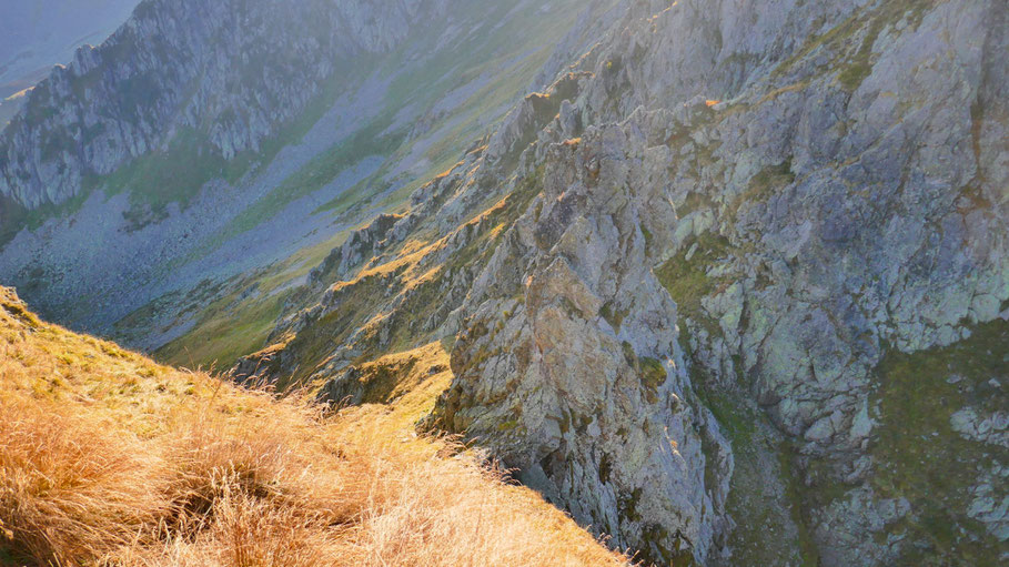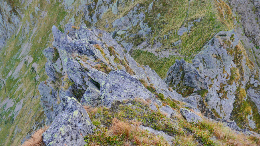 Ich entscheide mich zur südlichen Umgehung und nehme die erstbeste Möglichkeit, um wieder zum Grat zurückzukommen.