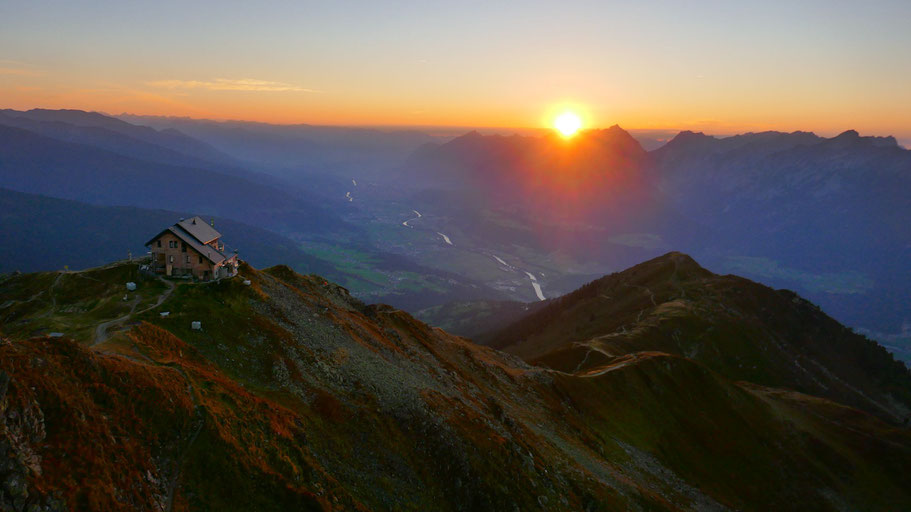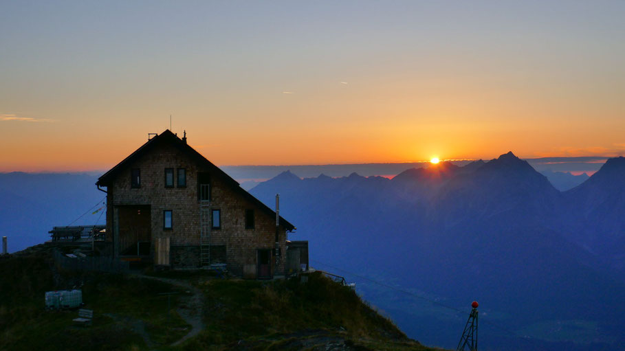 Kellerjochhütte (2.237m), in den letzten Sonnenstrahlen des Tages.