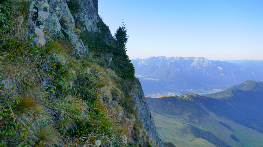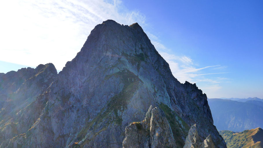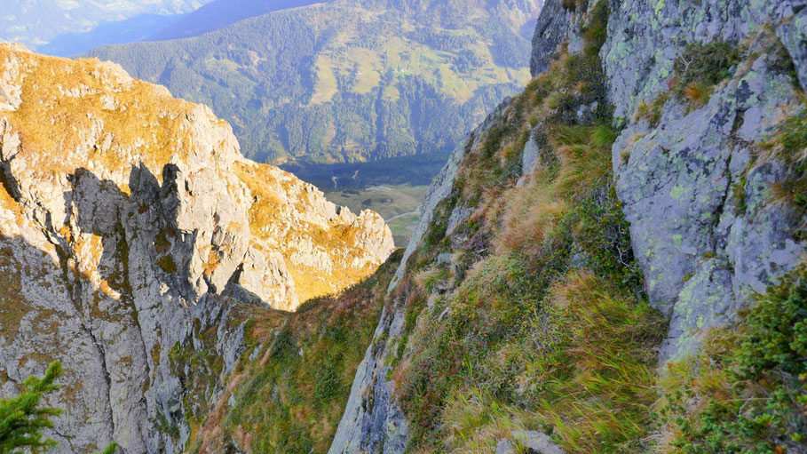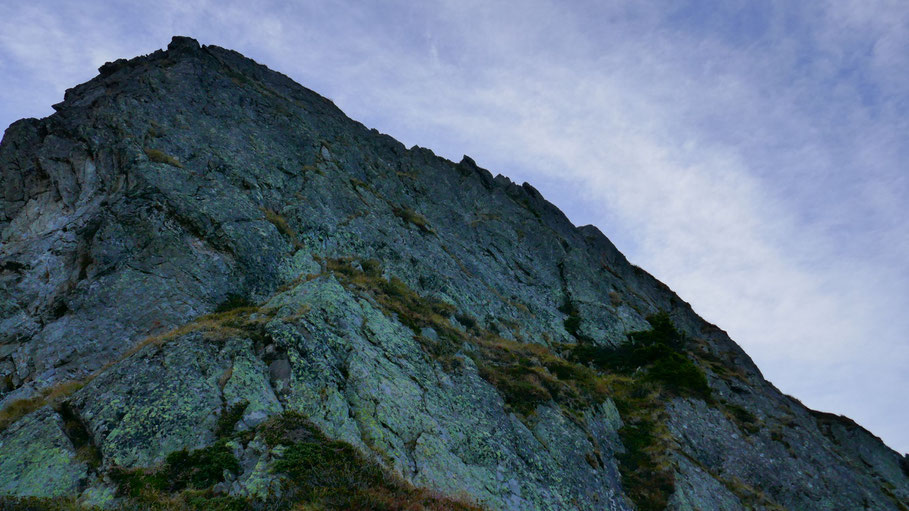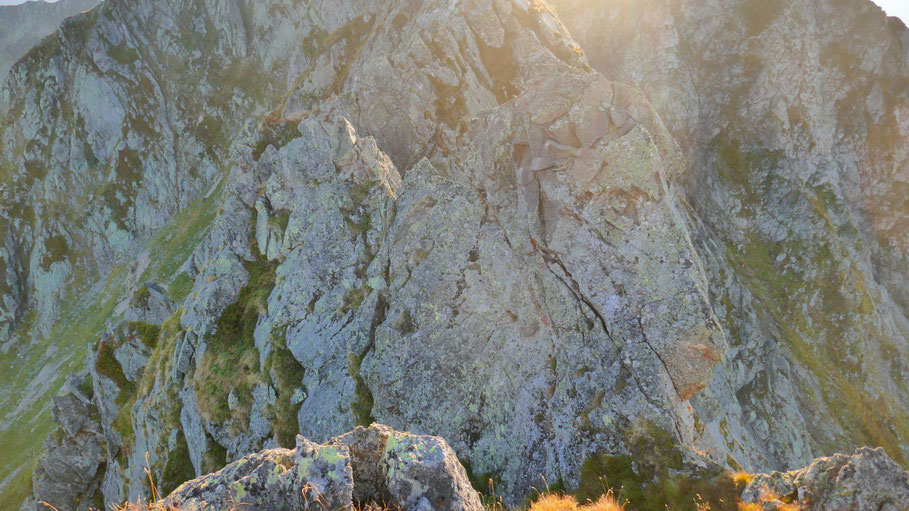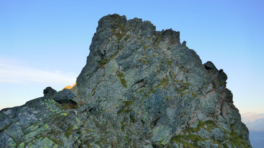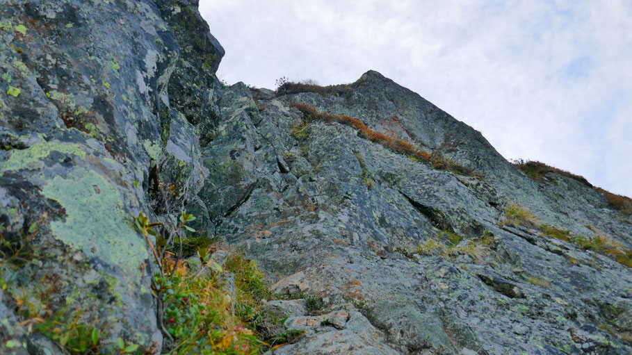 Na bumm, diesen mächtigen Zapfen habe ich schon von unten ausmachen können. Ich studiere die Anstiegsmöglichkeiten. Um schwieriger Felskletterei auszuweichen (IV und mehr), kann es nur über das grasige Band nach rechts hinaus in die ausgesetzte Ostseite gehen.