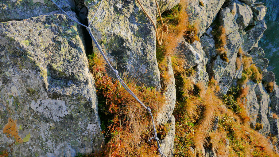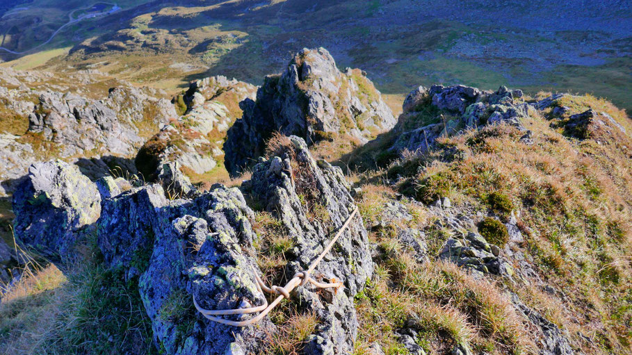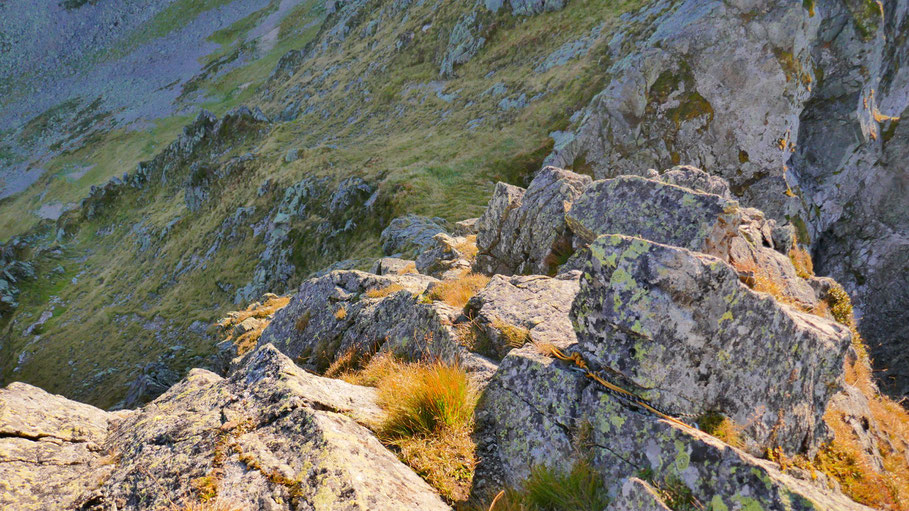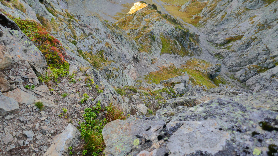 Man kann sich entweder am Seil in die Südflanke runterhanteln, oder wie ich ziemlich direkt und steil in die Scharte absteigen.