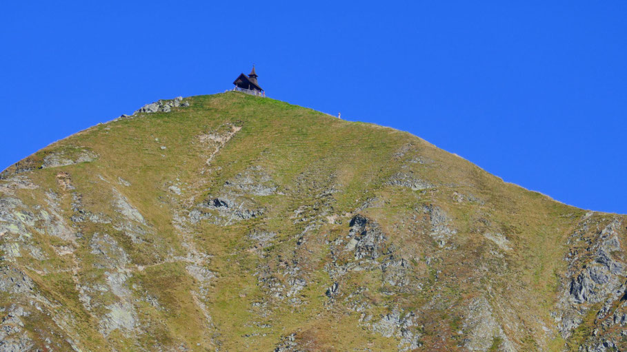 Das war's - runter in einen kleinen Sattel und hinauf zur Gipfelkapelle am Kreuzjoch (2.344m).