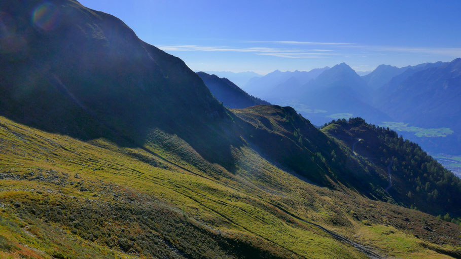 An der Nordseite etwas abwärts Richtung Alte Kellerjochhütte und Proxenalm. Im Winter sind Nelli und ich da runtergezischt. Vorne der lohnenswerte Gratzenkopf (2.087m).