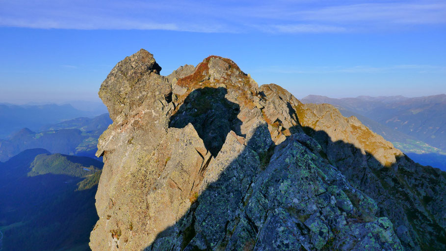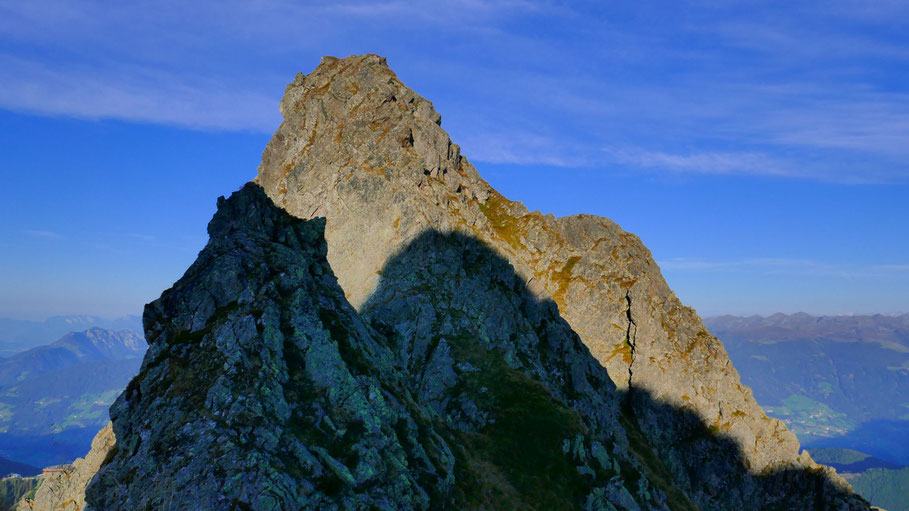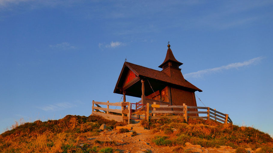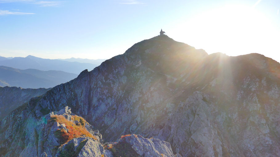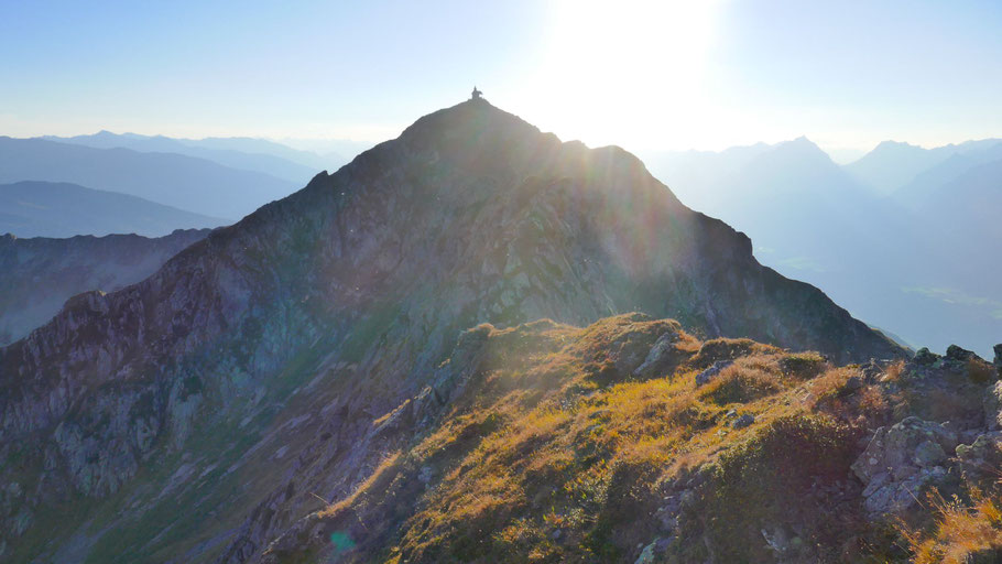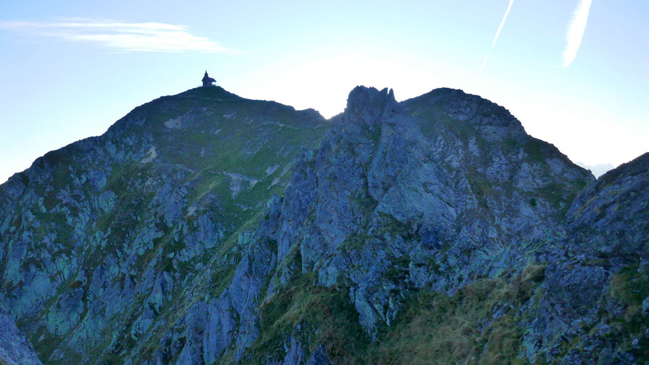 Oben die Kapelle am Kreuzjoch (2.344m), von dort werde ich mir später den Sonnenuntergang erste Reihe fußfrei ansehen. Vorher habe ich aber noch ein Gustostückerl eingeplant.
