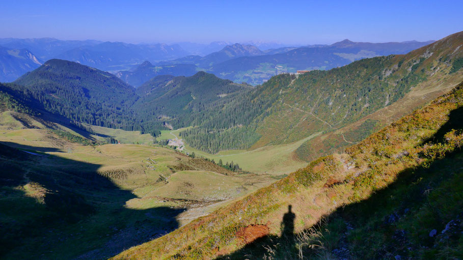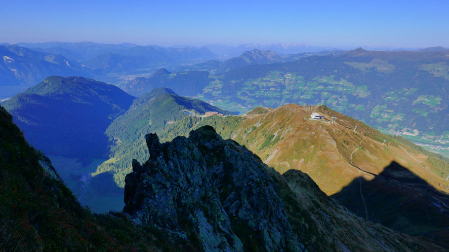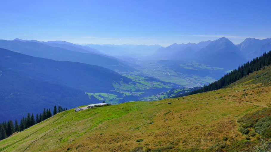 Schöner Blick Richtung Unterinntal und in das Öxltal, das ich damals auf meiner Kellerjoch-Umrundung mit dem Bike durchquert habe. Nun nochmals ein kleiner wegloser Abstieg zum Kaunzalm-Hochleger vorbei am alten Bergwerk. Vorne rechts die Anlagen des Skigebiets Fügen-Spieljoch.