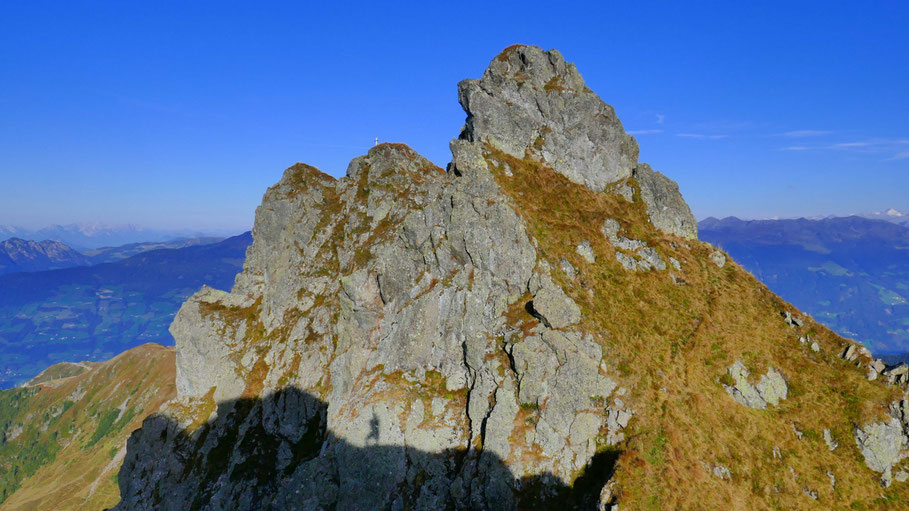 Nicht über den Kopf drüber, sondern unterhalb auf Reibung und über eine zwar kurze, aber sehr schmale und ausgesetzte Gratstelle.