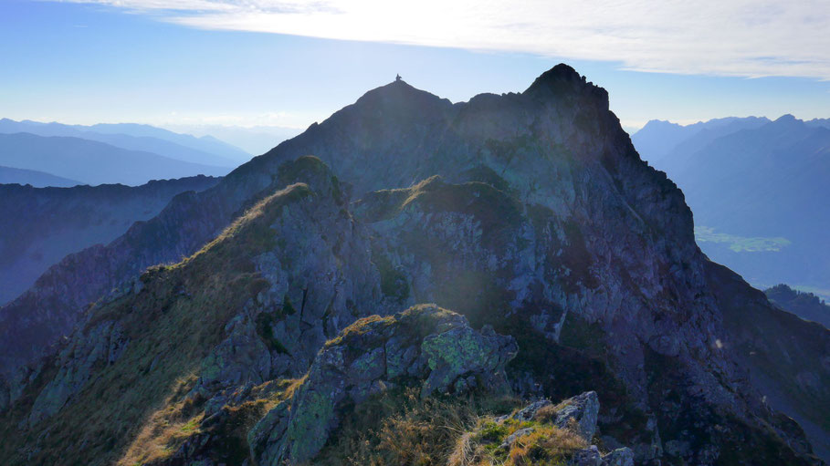 Langsam komme ich der Kapelle näher. Es wartet ein letzter Gratkopf, mit leicht ausgesetztem Aufstieg in der südlichen Flanke (II+).