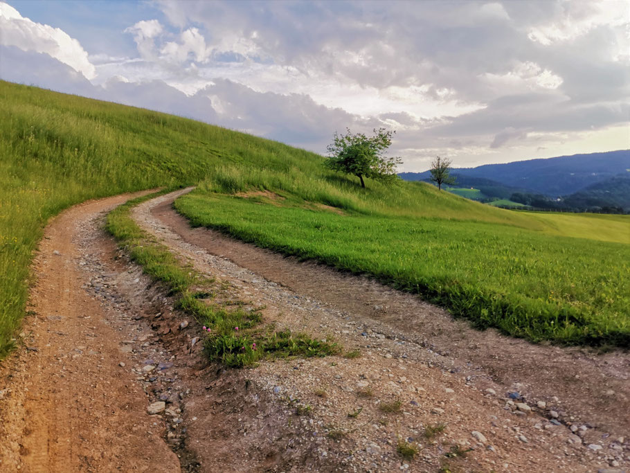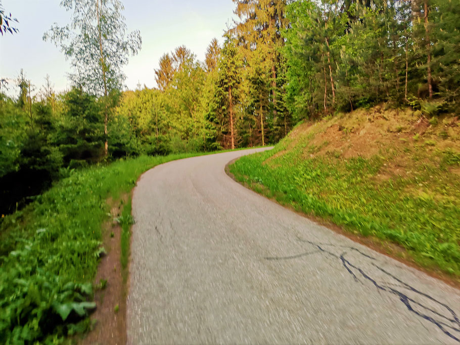 Nach einem kurzen Abschnitt querfeldein geht's auf der Straße talwärts.
