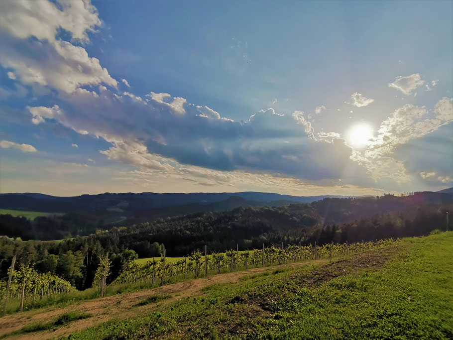 slowenische Grenzgebirge liegt hinter den Weinreben vor mir.